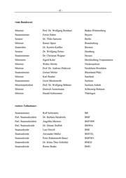 - II - vom Bundesrat: Minister Prof. Dr. Wolfgang Reinhart Baden-Württemberg Staatsminister Erwin Huber Bayern Senator Dr. Thilo Sarrazin Berlin Minister Rainer Speer Brandenburg Staatsrätin Dr. Kerstin Kießler Bremen Senator Dr. Wolfgang Peiner Hamburg Staatsminister Dr. Christean Wagner Hessen Ministerin Sigrid Keler Mecklenburg-Vorpommern Minister Walter Hirche Niedersachsen Minister Prof. Dr. Andreas Pinkwart Nordrhein-Westfalen Staatsminister Gernot Mittler Rheinland-Pfalz Minister Karl Rauber Saarland Staatsminister Geert Mackenroth Sachsen Ministerpräsident Prof. Dr. Wolfgang Böhmer Sachsen-Anhalt Minister Dietrich Austermann Schleswig-Holstein Minister Harald Schliemann Thüringen weitere Teilnehmer: Staatsminister Rolf Schwanitz BK Parl. Staatssekretärin Dr. Barbara Hendricks BMF Parl. Staatssekretärin Angelika Mertens BMVBW Parl. Staatssekretär Dr. Ditmar Staffelt BMWA Staatssekretär Lutz Diwell BMI Staatssekretär Alexander Müller BMVEL Staatssekretär Peter Ruhenstroth-Bauer BMFSFJ Staatssekretär Dr. Klaus Theo Schröder BMGS Staatssekretär Rainer Baake BMU