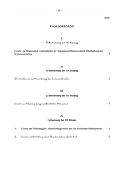 - III - Seite TAGESORDNUNG I. 7. Fortsetzung der 45. Sitzung Gesetz zur finanziellen Unterstützung der Innovationsoffensive durch Abschaffung der Eigenheimzulage 2 II. 3. Fortsetzung der 53. Sitzung Zweites Gesetz zur Neuordnung des Gentechnikrechts 3 III. 2. Fortsetzung der 54. Sitzung Gesetz zur Stärkung der gesundheitlichen Prävention 4 IV. Fortsetzung der 55. Sitzung 1. Gesetz zur Änderung des Absatzfondsgesetzes und des Holzabsatzfondsgesetzes 5 2. Gesetz zur Errichtung einer "Bundesstiftung Baukultur" 6