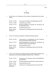 -V- Seite 4. Gesetz zur Änderung des Abfallverbringungsgesetzes sowie zur Auflösung und Abwicklung der Anstalt Solidarfonds Abfallrückführung 10 BT-Drs. 15/5243 Gesetzentwurf der Fraktionen SPD und BÜNDNIS 90/ DIE GRÜNEN BT-Drs. 15/5523 textidentischer Gesetzentwurf der BReg., Stellungnahme des BR und Gegenäußerung der BReg. BT-Drs. 15/5726 Beschlussempfehlung und Bericht des Ausschusses für Umwelt, Naturschutz und Reaktorsicherheit BR-Drs. 456/05 Gesetzesbeschluss des BT BR-Drs. 456/05 Anrufung des Vermittlungsausschusses durch den BR (Beschluss) 5. Gesetz zur Änderung telekommunikationsrechtlicher Vorschriften 13 BT-Drs. 15/5213 Gesetzentwurf der BReg., Stellungnahme des BR und Gegenäußerung der BReg. BT-Drs. 15/5694 Beschlussempfehlung und Bericht des Ausschusses für Wirtschaft und Arbeit BR-Drs. 438/05 Gesetzesbeschluss des BT BR-Drs. 438/05 Anrufung des Vermittlungsausschusses durch den BR (Beschluss) 6. Zwanzigstes Gesetz zur Änderung des Umsatzsteuergesetzes und zur Änderung des Einkommensteuergesetzes 14 BT-Drs. 15/5444 Gesetzentwurf der Fraktionen SPD und BÜNDNIS 90/ DIE GRÜNEN BT-Drs. 15/5558 textidentischer Gesetzentwurf der BReg. BT-Drs. 15/5812 Stellungnahme des BR und Gegenäußerung der BReg. BT-Drs. 15/5863 Beschlussempfehlung und Bericht des Finanzausschusses BR-Drs. 516/05 Gesetzesbeschluss des BT BR-Drs. 516/05 Nichtzustimmung des BR (Beschluss) BR-Drs. 587/05 Anrufung des Vermittlungsausschusses durch die BReg. Verschiedenes 15 ***