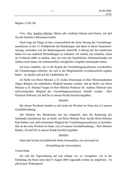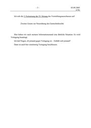 -1- 05.09.2005 zi-bo Beginn: 15.06 Uhr Vors. Abg. Joachim Hörster: Meine sehr verehrten Damen und Herren, ich darf Sie alle herzlich willkommen heißen. Nach Lage der Dinge ist dies voraussichtlich die letzte Sitzung des Vermittlungs- ausschusses in der 15. Wahlperiode des Bundestages und damit in dieser Zusammen- setzung, zumindest was die Bundestagsseite anbetrifft; in Bezug auf die Länderseite haben wir uns natürlich Mutmaßungen zu enthalten. Ich möchte mir erlauben, schon im Vorhinein dafür zu danken, dass wir trotz des beachtlichen Arbeitsaufwandes am Schluss doch immer ein mitmenschlich verträgliches Umgehen miteinander hatten. Ich muss zunächst, wie es die Regeln des Vermittlungsausschusses vorschreiben, die Veränderungen mitteilen, die sich in der Mitgliedschaft zwischenzeitlich ergeben haben - sie spielen sich auf der Länderebene ab -: An Stelle von Herrn Minister a. D. Jochen Dieckmann ist Herr Ministerpräsident Jürgen Rüttgers als ordentliches Mitglied benannt worden, und an Stelle von Herrn Minister a. D. Michael Vesper ist Herr Minister Professor Dr. Andreas Pinkwart zum stellvertretenden Mitglied des Vermittlungsausschusses bestellt worden. - Herr Professor Pinkwart, ich darf Sie in unserer Runde herzlich begrüßen. (Beifall) Bei diesen Wechseln handelt es sich nicht um Wechsel im Sinne des § 4 unserer Geschäftsordnung. Der Direktor des Bundesrates hat uns mitgeteilt, dass die Regierung des Saarlandes beschlossen hat, an Stelle von Herrn Minister Peter Jacoby Herrn Minister Karl Rauber zum stellvertretenden Mitglied des Vermittlungsausschusses zu bestellen. Das ist der erste Wechsel im Sinne von § 4 unserer Geschäftsordnung. - Herr Minister Rauber, ich darf Sie in unserer Runde herzlich begrüßen. (Beifall) Dann darf ich die Geschäftsstelle bitten festzustellen, wer anwesend ist. (Feststellung der Anwesenheit) Vielen Dank. Ich rufe die Tagesordnung auf und schlage vor, so vorzugehen, wie in der Einladung, die Ihnen unter dem 9. August 2005 zugesandt worden ist, aufgelistet. - Es gibt keinen Widerspruch.