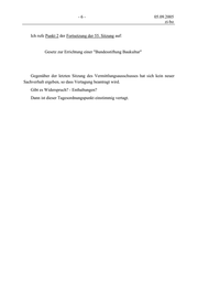 -6- 05.09.2005 zi-bo Ich rufe Punkt 2 der Fortsetzung der 55. Sitzung auf: Gesetz zur Errichtung einer "Bundesstiftung Baukultur" Gegenüber der letzten Sitzung des Vermittlungsausschusses hat sich kein neuer Sachverhalt ergeben, so dass Vertagung beantragt wird. Gibt es Widerspruch? - Enthaltungen? Dann ist dieser Tagesordnungspunkt einstimmig vertagt.