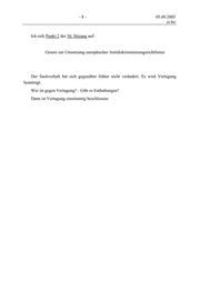 -8- 05.09.2005 zi-bo Ich rufe Punkt 2 der 56. Sitzung auf: Gesetz zur Umsetzung europäischer Antidiskriminierungsrichtlinien Der Sachverhalt hat sich gegenüber früher nicht verändert. Es wird Vertagung beantragt. Wer ist gegen Vertagung? - Gibt es Enthaltungen? Dann ist Vertagung einstimmig beschlossen.