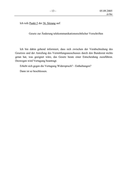 - 13 - 05.09.2005 zi-bo Ich rufe Punkt 5 der 56. Sitzung auf: Gesetz zur Änderung telekommunikationsrechtlicher Vorschriften Ich bin dahin gehend informiert, dass sich zwischen der Verabschiedung des Gesetzes und der Anrufung des Vermittlungsausschusses durch den Bundesrat nichts getan hat, was geeignet wäre, das Gesetz heute einer Entscheidung zuzuführen. Deswegen wird Vertagung beantragt. Erhebt sich gegen die Vertagung Widerspruch? - Enthaltungen? Dann ist so beschlossen.