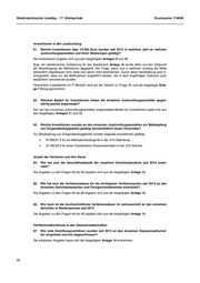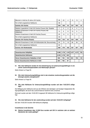 Niedersächsischer Landtag – 17. Wahlperiode Drucksache 17/8839 Investitionen in den Justizvollzug 61. Welche Investitionen über 10 000 Euro wurden seit 2013 in welchem Jahr an welchen Justizvollzugsanstalten und ihren Abteilungen getätigt? Die Investitionen ergeben sich aus den beigefügten Anlagen 9 und 10. Bzgl. der tabellarischen Aufstellung für den Baubereich Anlage 10 wurde allein auf den Zeitpunkt der Beauftragung der Maßnahme abgestellt. Die Frage, wann und in welchem Umfang die Mittel tatsächlich abgeflossen sind, lässt sich damit nicht beantworten. Durch diese Handhabung wird si- chergestellt, dass nur die Maßnahmen aufgeführt werden, die in dem angefragten Zeitraum auch tatsächlich verantwortet wurden. Hinsichtlich Investitionen im IT-Bereich wird auf die Antwort zu Frage 55 und die beigefügte Anla- ge 7 Bezug genommen. 62. Welchen Bedarf für Investitionen haben die einzelnen Justizvollzugsanstalten gegen- wärtig jeweils angemeldet? Der von den einzelnen Justizvollzugsanstalten angemeldete Bedarf für Investitionen ergibt sich aus den beigefügten Anlagen 11 und 12. 63. Welche Investitionen wurden an den einzelnen Justizvollzugsanstalten zur Bekämpfung von Drogenabhängigkeiten getätigt (einschließlich neuen Personals)? Zur Bekämpfung von Drogenabhängigkeiten wurden folgende Investitionen getätigt: • 16.599,61 € für ein Methadondosiergerät in der JVA Oldenburg • 12.190,29 € für einen Substitutions-Dosierautomaten in der JVA Sehnde. Anzahl der Verfahren und ihre Dauer 64. Wie hat sich die Geschäftsstatistik der einzelnen Gerichtsstandorte seit 2013 entwi- ckelt? Die Angaben zu den Fragen 64 bis 66 ergeben sich aus der beigefügten Anlage 13. 65. Wie hat sich die Verfahrensdauer für die wichtigsten Verfahrensarten seit 2013 an den einzelnen Gerichtsstandorten und Fachgerichtsbarkeiten entwickelt? Die Angaben zu den Fragen 64 bis 66 ergeben sich aus der beigefügten Anlage 13. 66. Wie hoch ist die durchschnittliche Verfahrensdauer im Jahresschnitt an den einzelnen Gerichten in Niedersachsen seit 2013 Die Angaben zu den Fragen 64 bis 66 ergeben sich aus der beigefügten Anlage 13. Verfahrensabschlüsse in den Staatsanwaltschaften 67. Wie viele Ermittlungsverfahren wurden seit 2013 an den einzelnen Staatsanwaltschaf- ten eingeleitet und wie abgeschlossen? Die erbetenen Angaben lasse sich der beigefügten Anlage 14 entnehmen. 56