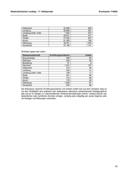 Niedersächsischer Landtag – 17. Wahlperiode Drucksache 17/8839 Hildesheim 24.936 928 Lüneburg 20.695 361 Lüneburg ZwSt. Celle 7.402 247 Stade 20.871 471 Verden 27.032 637 Aurich 21.353 756 Oldenburg 46.451 1.355 Osnabrück 37.182 1.121 Straftaten gegen das Leben: Staatsanwaltschaft Ermittlungsverfahren Urteile Braunschweig 469 90 Göttingen 254 32 Bückeburg 57 9 Hannover 1.421 157 Hildesheim 313 66 Lüneburg 430 41 Lüneburg ZwSt. Celle 108 17 Stade 251 56 Verden 413 66 Aurich 179 22 Oldenburg 1.026 87 Osnabrück 524 96 Die Diskrepanz zwischen Ermittlungsverfahren und Urteilen erklärt sich aus dem Umstand, dass es mit dem Strafbefehl eine praktisch sehr bedeutsame alternative sanktionierende Erledigungsform gibt und es im Übrigen zu unterschiedlichen Verfahrenseinstellungen kommt. Letztere können aus tatsächlichen oder rechtlichen Gründen erfolgen, vorläufig oder endgültig sein sowie folgenlos oder mit Auflagen und Weisungen verbunden. 59