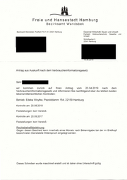 An —A_ Freie und Hansestadt Bezirksamt Wandsbek Hamburg BezirksamtWandsbek, Postfach70 21 41, 22021 Hamburg Dezernat Wirtschaft,Bauen und Umwelt Fachamt Umwelt Herr IverBreese Verbraucherschutz, Gewerbe Schloßgarten9 22041Hamburg ██████▏ ███ █▏██ ██ █▏ ███▏ ██████▏ ███▏████████▏ █████▏████████████████████ ██████████████████ ███████████ Antragaus Auskunftnach dem Verbraucherinformationsgesetz Sehr geehrterHerrBreese, wir kommen zurück auf Ihren Antrag vom 23.04.2019 nach dem Veerbraucherinformationsgesetz und informierenSie nachfolgend überdie letztenbeiden lebensmiittelrechtlichen Kontrollen: Betrieb:Edeka Woytke, Pezolddamm 154, 22159 Hamburg Kontrolle am: 20.08.2018 Feststellungen:keinVerstoß Kontrolle am: 20.09.2017 Feststellungen:keinVerstoß Rechtsbehelfsbelehrung Gegendiesen Bescheid kann innerhalbeines Monats nach Bekanntgabe bei der im Briefkopf Widerspruch eingelegtwerden. bezeichneten Dienststelle DiesesSchreibenwurde maschinell erstellt und istdaher ohne Unterschrift gültig und