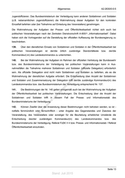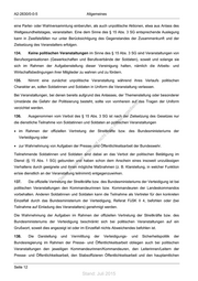 Allgemeines A2-2630/0-0-5 Jugendoffizieren. Das Bundesministerium der Verteidigung kann anderen Soldatinnen und Soldaten (z.B. nebenamtlichen Jugendoffizieren) die Wahrnehmung dieser Aufgaben für den konkreten Einzelfall befehlen oder (bei Teilnahme auf Einladung des Veranstalters) genehmigen. Die Wahrnehmung der Aufgaben der Presse- und Öffentlichkeitsarbeit richtet sich auch bei politischen Veranstaltungen nach der Zentralen Dienstvorschrift A-600/1 „Informationsarbeit“. Dabei haben sich die Vortragenden auf die Darstellung der offiziellen Auffassung der Bundesregierung zu beschränken. 139. Über den dienstlichen Einsatz von Soldatinnen und Soldaten in der Öffentlichkeitsarbeit bei politischen Veranstaltungen ist der/die örtlich zuständige Standortälteste bzw. der/die Kommandeur(-in) des Landeskommandos zu unterrichten. 140. Bei der Wahrnehmung der Aufgaben im Rahmen der offiziellen Vertretung der Bundeswehr bzw. des Bundesministeriums der Verteidigung bei politischen Veranstaltungen kann in Aus- ! st ie nahmefällen die Teilnahme mehrerer Soldatinnen und Soldaten (offizielle Delegation) erforderlich n ru ng sein. Als offizielle Delegation sind nicht mehr Soldatinnen und Soldaten zu befehlen, als es die sd Wahrnehmung der dienstlichen Aufgabe erfordert. Die Entscheidung über Anzahl der Soldatinnen de Än und Soldaten und Zusammensetzung der Delegation trifft der/die zuständige Kommandeur(in) des em Landeskommandos bzw. das Bundesministerium der Verteidigung entsprechend Nr. 137. ht d 141. ni Die Bestimmungen der Nr. 140 gelten sinngemäß auch bei der Wahrnehmung der Aufgaben c eg t der Öffentlichkeitsarbeit bei politischen Veranstaltungen. Die Entscheidung über die Anzahl der rli Soldatinnen und Soldaten trifft un in tediesem Fall der Presse- und Informationsstab des Bundesministeriums der Verteidigung. ck dr u 142. us Können Zweifel über die Anwendung dieser Bestimmungen nicht behoben werden, so ist - rA notfalls fernmündlich oder fernschriftlich - unter Angabe des Gegenstandes und Zweckes der iese Veranstaltung, des Veranstalters oder sonstiger für die Beurteilung erheblicher Umstände die D Entscheidung des/der zuständigen Kommandeur(in) des Landeskommandos bzw. des Bundesministeriums der Verteidigung, Referat FüSK II 4 bzw. Presse- und Informationsstab / Referat Öffentlichkeitsarbeit einzuholen. Seite 13 Stand: Juli 2015