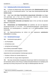 A2-2630/0-0-5 Allgemeines 1.4.4 Selbstbeschaffte Uniformteile/Abzeichen 143. Im Rahmen der Bestimmungen dieser Zentralrichtlinie dürfen Bekleidungsartikel getragen 7 werden, die nicht zum Ausstattungssoll gehören. Das Tragen dieser Bekleidungsartikel darf nicht befohlen werden. 144. Jedes Tragen nicht dieser Zentralrichtlinie entsprechender Uniformteile, das Anlegen nicht genehmigter oder in Form und Farbe abweichender Abzeichen sowie zweckwidrige Verwendung bundeswehreigener Bekleidung ist unzulässig. 145. Selbstbeschaffte Uniformteile und Abzeichen haben in Form und Farbe den dienstlich gelieferten zu entsprechen. 146. Selbsteinkleider und Teilselbsteinkleider sind verpflichtet, alle nach den Allgemeinen Verwaltungsvorschriften zu § 69 Abs. 1 des Bundesbesoldungsgesetzes vorgeschriebenen ! Bekleidungs- und Ausrüstungsstücke zu beschaffen und in voll verwendungsfähigem Zustand st ie n bereitzuhalten. ru ng sd 147. Die Ergänzung/Abwandlung der Uniform mit nicht zugelassenen ausländischen de Uniformteilen ist unzulässig. Än em ht 1.4.5 Sonderbestimmungen d ni c 148. Sonderbestimmungen gelten für eg t rli • das Wachbataillon unte ck • die Musikkorps sowie dr u us • die Big Band der Bundeswehr, rA iese bei der Erfüllung repräsentativer Aufgaben, D • die bi-/multinational zusammengesetzten Verbände entsprechend den zwischenstaatlichen Vereinbarungen sowie bei • Einsätzen im Rahmen der Vereinten Nationen und • der NATO, WEU, EU und ggf. weiterer Organisationen. 149. Über diese Zentralrichtlinie hinausgehende Abweichungen befiehlt die Kommandeurin bzw. der Kommandeur Zentrum Innere Führung im Auftrag des Bundesministeriums der Verteidigung oder genehmigt sie auf Antrag. Dies gilt auch für das Tragen von Bekleidungsstücken alter Form. 7 Sofern nicht ein einheitlicher Anzug gemäß Nr. 111 befohlen wurde. Seite 14 Stand: Juli 2015