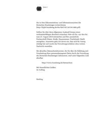 Seite 2 ihn in dem Dokumentations- und Informationssystem des Deutschen Bundestages recherchieren (http://dipbt.bundestag.de/doc/btd/19/118/1911800.pdf). Sollten Sie über diese allgemeine Auskunft hinaus einen rechtsmittelfähigen Bescheid wünschen, bitte ich Sie, mir dies bis zum 23. August 2019 mitzuteilen und Ihre persönliche Postanschrift (Name, Straße, Hausnummer, Postleitzahl, Stadt) anzugeben. Ansonsten gehe ich davon aus, dass sich Ihr Antrag erledigt hat und werde das Verwaltungsverfahren ohne weitere Nachricht einstellen. Die aktuellen Datenschutzhinweise, die Sie über die Erhebung und Verarbeitung Ihrer personenbezogenen Daten durch die Verwaltung des Deutschen Bundestages informieren, sind unter folgendem Link abrufbar: https://www.bundestag.de/datenschutz Mit freundlichen Grüßen im Auftrag Hertling