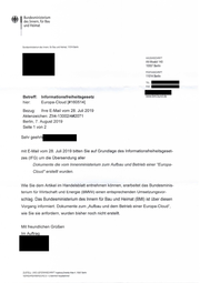 AR i Bundesministerium > N des Innern,für Bau 3 und Heimat Bundesministerium des Innern, für Bau und Heimat, 11014 Berlin HAUSANSCHRIFT Alt-Moabit 140 10557 Berlin POSTANSCHRIFT 11014 Berlin ve. FAX Betreff: Informationsfreiheitsgesetz hier: Europa-Cloud [#160514] Bezug: Ihre E-Mail vom 28. Juli 2019 www.bmi.bund.de Aktenzeichen: Z114-13002/4#2071 Berlin, 7. August 2019 Seite 1 von 2 mit E-Mail vom 28. Juli 2019 bitten Sie auf Grundlage desInformationsfreiheitsgeset- zes (IFG) um die Übersendung aller Dokumente die vom Innenministerium zum Aufbau und Betrieb einer "Europa- Cloud" erstellt wurden. Wie Sie dem Artikel im Handelsblatt entnehmen können, erarbeitet das Bundesminis- terium für Wirtschaft und Energie (BMWi) einen entsprechenden Umsetzungsvor- schlag. Das Bundesministerium des Innern für Bau und Heimat (BMI) ist über diesen Vorgang informiert. Dokumente zum „Aufbau und dem Betrieb einer Europa-Cloud“, wie Sie sie anfordern, wurden bisher noch nicht erstellt. Mit freundlichen Grüßen Im Auftra ZUSTELL- UND LIEFERANSCHRIFT Ingeborg-Drewitz-Allee 4, 10557 Berlin VERKEHRSANBINDUNG S + U-Bahnhof Hauptbahnhof