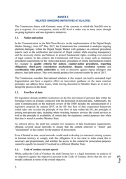 ANNEX 1 RELATED ONGOING INITIATIVES AT EU LEVEL The Commission shares with Germany many of the concerns to which the NetzDG tries to give a response. As a consequence, action at EU level is under way in many areas, through on-going legislative and non-legislative initiatives: 1.1. Notice and action In the Communication on the Mid-Term Review on the implementation of the Digital Single th Market Strategy, from 10 May 2017, the Commission has committed to underpin ongoing platform dialogues within the Digital Single Market with guidance on coherent procedural aspects such as the notification and removal of illegal content while ensuring transparency and the necessary checks and balances to protect fundamental rights, avoiding over-removal of legal content. In this context, the Commission will focus on issues such as minimum procedural requirements for the ‘notice and action’ procedures of online intermediaries related for example to quality criteria for notices, counter-notice procedures, reporting obligations, third-party consultation mechanisms, dispute resolution systems and coordination with public authorities as well as measures against repeat infringers and abusive, bad-faith notices. This work should produce first concrete results by end of 2017. The Commission considers that national solutions at this respect can lead to unwanted legal fragmentation and have a negative effect on innovation; guidance on the main common principles can address these issues, while leaving discretion to Member States as to how to design the process in the detail. 1.2. Free flow of data EU legislation already prohibits restrictions on the free movement of personal data within the European Union on grounds connected with the protection of personal data. Additionally, the same Communication on the mid-term review of the DSM includes the announcement of a legislative proposal, by autumn 2017, on the EU free flow of data cooperation framework which takes into account the principle of free flow of data within the EU, the principle of porting non-personal data, including when switching business services like cloud services as well as the principle of availability of certain data for regulatory control purposes also when that data is stored in another Member State. As referred above, the draft law contains two instances of data localisation requirements, obliging covered social networks to ensure that the content removed is "stored" and "documented" in the country for the purpose of prosecution. Even if limited in time, social networks would need to develop (or outsource) storing systems in German territory to comply with this obligation. It is not clear to what extent this is necessary and proportionate, and whether the access to this content for prosecution purposes cannot be equally be ensured if localised in a different Member State. While, unlike the Code of Conduct, the draft German law is a legal instrument, an analysis of its objectives against the objectives pursued in the Code of Conduct shows that the two are broadly coherent in terms of the overall objective. 5 5 Code of conduct on hate speech Page 1.3.