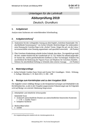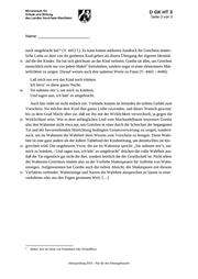Ministerium für Schule und Bildung NRW D GK HT 3 Seite 1 von 9 Unterlagen für die Lehrkraft Abiturprüfung 2019 Deutsch, Grundkurs 1. Aufgabenart Analyse eines Sachtextes mit weiterführendem Schreibauftrag 2. 1 Aufgabenstellung 1. Analysieren Sie den vorliegenden Auszug aus dem Kapitel „Gretchens Katastrophe: Die abschließende Szenensequenz“ von Jochen Schmidt. Berücksichtigen Sie insbesondere seine Deutung der Gretchen-Figur in der „Kerker“-Szene. Zeigen Sie auf, wie der Litera- turwissenschaftler seine Deutung argumentativ und sprachlich entwickelt. (40 Punkte) 2. Über Gretchens Kindestötung schreibt Jochen Schmidt, dass diese „Tat eigentlich gar nicht die ihre, sondern letztlich die der Gesellschaft ist“ (Z. 52). Stellen Sie anhand ausgewähl- ter Szenen dar, welche gesellschaftlichen Einflüsse zu ihrer Tat beitragen. Erläutern Sie anschließend die Bedeutung der Figuren Faust und Mephisto für Gretchens Handeln. Nehmen Sie abschließend Stellung zu Schmidts oben zitierter Aussage. (32 Punkte) 3. Materialgrundlage • Jochen Schmidt: Goethes Faust. Erster und Zweiter Teil. Grundlagen – Werk – Wirkung. 3. Auflage. München: C. H. Beck 2011, S. 206 – 208 4. Bezüge zum Kernlehrplan und zu den Vorgaben 2019 Die Aufgaben weisen vielfältige Bezüge zu den Kompetenzerwartungen und Inhaltsfeldern des Kernlehrplans bzw. zu den in den Vorgaben ausgewiesenen Fokussierungen auf. Im Folgenden wird auf Bezüge von zentraler Bedeutung hingewiesen. 1. Inhaltsfelder und inhaltliche Schwerpunkte Inhaltsfeld Texte • strukturell unterschiedliche Dramen aus unterschiedlichen historischen Kontexten – J. W. v. Goethe: Faust I • komplexe Sachtexte 2. Medien/Materialien • entfällt 1 Die Aufgabenstellung deckt inhaltlich alle drei Anforderungsbereiche ab. Abiturprüfung 2019 – Nur für den Dienstgebrauch!