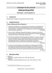 Ministerium für Schule und Bildung NRW BI LK HT 2 (GG) Seite 2 von 8 ● Material C Abbildung 3: verändert nach Matos-Cruz et al., 2017, Abb. 1D, S. 3330 Abbildung 4: verändert nach Matos-Cruz et al., 2017, Abb. 3E und 3F, S. 3332 ● Bautista, D. M., Siemens, J., Glazer, J. M., Tsuruda, P. R., Basbaum, A. I., … Julius, D. (2007). The menthol receptor TRPM8 is the principal detector of environmental cold. Nature, 448(7150), 204–208. https://doi.org/10.1038/nature05910 Madrid, R. & Pertusa, M. (2014). Intimacies and Physiological Role of the Polymodal Cold-Sensitive Ion Channel TRPM8. In L. D. Islas & F. Qin (Hrsg.), Current Topics in Membranes (Bd. 74, S. 293–324). Academic Press. https://doi.org/10.1016/B978-0-12- 800181-3.00011-7 Matos-Cruz, V., Schneider, E. R., Mastrotto, M., Merriman, D. K., Bagriantsev, S. N. & Gracheva, E. O. (2017). Molecular Prerequisites for Diminished Cold Sensitivity in Ground Squirrels and Hamsters. Cell Reports, 21(12), 3329–3337. https://doi.org/10.1016/j.celrep.2017.11.083 Pertusa, M., Rivera, B., González, A., Ugarte, G. & Madrid, R. (2018). Critical role of the pore domain in the cold response of TRPM8 channels identified by ortholog functional comparison. Journal of Biological Chemistry, jbc.RA118.002256. https://doi.org/10.1074/jbc.RA118.002256 Story, G. M., Peier, A. M., Reeve, A. J., Eid, S. R., Mosbacher, J., … Patapoutian, A. (2003). ANKTM1, a TRP-like Channel Expressed in Nociceptive Neurons, Is Activated by Cold Temperatures. Cell, 112(6), 819–829. https://doi.org/10.1016/S0092- 8674(03)00158-2 ● ● ● ● 4. Bezüge zum Kernlehrplan und zu den Vorgaben 2019 Die Aufgaben weisen vielfältige Bezüge zu den Kompetenzerwartungen und Inhaltsfeldern des Kernlehrplans bzw. zu den in den Vorgaben ausgewiesenen Fokussierungen auf. Im Folgenden wird auf Bezüge von zentraler Bedeutung hingewiesen. 1. Inhaltsfelder und inhaltliche Schwerpunkte Neurobiologie ● Aufbau und Funktion von Neuronen ● Neuronale Informationsverarbeitung und Grundlagen der Wahrnehmung Ökologie ● Umweltfaktoren und ökologische Potenz Evolution ● Grundlagen evolutiver Veränderung 2. Medien/Materialien entfällt 5. ● ● Zugelassene Hilfsmittel GTR (Grafikfähiger Taschenrechner) oder CAS (Computer-Algebra-System) Wörterbuch zur deutschen Rechtschreibung Abiturprüfung 2019 – Nur für den Dienstgebrauch!