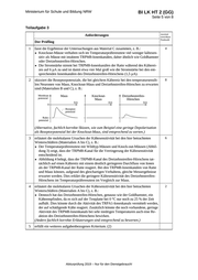 Ministerium für Schule und Bildung NRW BI LK HT 2 (GG) Seite 3 von 8 6. Vorgaben für die Bewertung der Schülerleistungen Teilleistungen – Kriterien a) inhaltliche Leistung Teilaufgabe 1 Anforderungen maximal erreichbare Punktzahl 1 stellt eine Methode zur Untersuchung von Ionenströmen an Ionenkanälen dar, z. B.: ● Die Patch-Clamp-Technik erlaubt es, den Ionenfluss durch einen Ionenkanal zu messen. Dazu wird eine sehr feine Saugkapillare mit einer Messelektrode so auf die Membran eines Neurons gesetzt, dass idealerweise nur ein Ionenkanal enthalten ist. ● Die Membran wird leicht angesaugt, sodass der Rand dicht abgeschlossen ist. Wird das Neuron einem Reiz ausgesetzt, kann der Ionenfluss durch den Kanal über die Änderung der Stromstärke ermittelt werden. (Falls die Voltage-Clamp-Technik dargestellt wird, ist das entsprechend zu bewerten.) 4 2 vergleicht die Temperaturempfindlichkeit der untersuchten Ionenkanäle der Maus (Abbildung 1), z. B.: ● Der TRPM8-Ionenkanal erreicht bei 20 °C einen Stromfluss von 0,4 relativen Ein- heiten und bei 17 °C von 0,7 relativen Einheiten, bei 15 °C ist der Stromfluss am höchsten mit 0,9 relativen Einheiten. ● Der TRPA1-Ionenkanal erreicht bei 20 °C einen Stromfluss von 0,1 relativen Ein- heiten und bei 17 °C von 0,2 relativen Einheiten, bei 15 °C ist der Stromfluss am höchsten mit etwa 0,95 relativen Einheiten. 4 3 vergleicht die Temperaturempfindlichkeit der untersuchten Ionenkanäle der Maus (Abbildung 1), z. B.: ● Beide Ionenkanäle reagieren auf die Abkühlung mit einer Erhöhung ihrer Ionenleit- fähigkeit, da der messbare Stromfluss zunimmt. ● Der TRPM8-Ionenkanal der Maus reagiert bereits auf leichte Abkühlung mit einer Erhöhung der Leitfähigkeit, während der TRPA1-Ionenkanal erst in niedrigeren Temperaturbereichen, aber dann stark, aktiviert wird. 4 4 begründet das Vorhandensein von TRPA1-Ionenkanälen in Schmerzrezeptoren (Ma- terial A), z. B.: ● Für gleichwarme Lebewesen wie die Maus ist eine Regulation der Körpertempera- tur entscheidend für das Überleben und daher muss bei möglicher Schädigung durch extrem kalte Temperaturen eine schnelle Reaktion ermöglicht werden. ● TRPA1-Ionenkanäle werden bei schädigender Kälte aktiviert. Daher muss eine schnelle Schutzreaktion des Körpers erfolgen, sodass kein dauerhafter Schaden ent- steht. Schmerz ist eine unspezifische Wahrnehmung von gefährlichen Reizen wie schädigender Kälte, Hitze oder Verletzungen und bewirkt eine sofortige Reaktion des Organismus. 4 5 erfüllt ein weiteres aufgabenbezogenes Kriterium. (2) Der Prüfling Abiturprüfung 2019 – Nur für den Dienstgebrauch!
