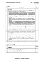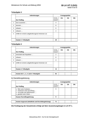 BI LK HT 2 (GG) Ministerium für Schule und Bildung NRW Seite 8 von 8 Teilaufgabe 3 Anforderungen Lösungsqualität maximal erreichbare Punktzahl Der Prüfling 1 fasst zusammen … 4 2 skizziert … 8 3 erläutert … 6 4 erläutert … 2 5 erfüllt ein weiteres aufgabenbezogenes Kriterium: (2) ………………………………………………………………… ………………………………………………………………… Summe 3. Teilaufgabe EK ZK DK 20 Teilaufgabe 4 Anforderungen Lösungsqualität maximal erreichbare Punktzahl Der Prüfling 1 entwickelt eine Hypothese … 2 2 erläutert … 8 3 erläutert … 4 4 erfüllt ein weiteres aufgabenbezogenes Kriterium: (2) ………………………………………………………………… ………………………………………………………………… Summe 4. Teilaufgabe 14 Summe der 1., 2., 3. und 4. Teilaufgabe 66 EK ZK DK b) Darstellungsleistung Anforderungen maximal erreichbare Punktzahl Der Prüfling ● ● ● ● Lösungsqualität führt seine Gedanken … strukturiert seine Darstellung … verwendet eine differenzierte … gestaltet seine Arbeit … EK ZK 9 Summe Darstellungsleistung 9 Summe insgesamt (inhaltliche und Darstellungsleistung) 75 Die Festlegung der Gesamtnote erfolgt auf dem Auswertungsbogen in LK HT 1. Abiturprüfung 2019 – Nur für den Dienstgebrauch! DK