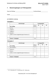 BI LK HT 2 (GG) Ministerium für Schule und Bildung NRW Seite 7 von 8 7. Bewertungsbogen zur Prüfungsarbeit Name des Prüflings: Kursbezeichnung: Schule: a) inhaltliche Leistung Teilaufgabe 1 Anforderungen Lösungsqualität maximal erreichbare Punktzahl Der Prüfling 1 stellt dar … 4 2 vergleicht … 4 3 vergleicht … 4 4 begründet … 4 5 erfüllt ein weiteres aufgabenbezogenes Kriterium: (2) ………………………………………………………………… ………………………………………………………………… Summe 1. Teilaufgabe EK 2 ZK DK 16 Teilaufgabe 2 Anforderungen maximal erreichbare Punktzahl Der Prüfling 1 fasst zusammen … 8 2 wertet aus … 2 3 erläutert … 6 4 erfüllt ein weiteres aufgabenbezogenes Kriterium: (2) ………………………………………………………………… ………………………………………………………………… Summe 2. Teilaufgabe 2 Lösungsqualität 16 EK = Erstkorrektur; ZK = Zweitkorrektur; DK = Drittkorrektur Abiturprüfung 2019 – Nur für den Dienstgebrauch! EK ZK DK