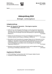 BI LK HT 3 (GG) Seite 1 von 5 Name: _______________________ Abiturprüfung 2019 Biologie, Leistungskurs Aufgabenstellung: Thema: Die Ägyptische Tigermücke – Überträgerin tropischer Krankheitserreger 1. Stellen Sie kurz die ökologischen Beziehungen zwischen Ägyptischen Tigermücken, Menschen, Zika-Viren und Pflanzen dar (Material A). Erklären Sie die Möglichkeiten und Probleme bei der bisherigen klassischen Bekämpfung der Tigermückenpopulation (Material A). (12 Punkte) 2. Erläutern Sie den Mechanismus der Tetracyclin-abhängigen Genregulation bei resistenten Bakterien unter Bezug auf Abbildung 1 (Material B). (14 Punkte) 3. Beschreiben Sie die Konstruktion der transgenen Region, die im Laborstamm LA513A enthalten ist, und nennen Sie die Funktion des Aktivatorbereiches im TTAV-Protein (Abbildung 2, Material C). Erläutern Sie die Mechanismen der Genregulation in LA513A (Abbildung 3) und erklären Sie die Auswirkungen für die transgenen Tigermücken (Material C). (22 Punkte) 4. Beurteilen Sie den Erfolg der Freisetzungsversuche und die möglichen Risiken auch unter Bezug auf Abbildung 4 (Materialien A bis D). (18 Punkte) Zugelassene Hilfsmittel: ● ● GTR (Grafikfähiger Taschenrechner) oder CAS (Computer-Algebra-System) Wörterbuch zur deutschen Rechtschreibung Abiturprüfung 2019 – Nur für den Dienstgebrauch!