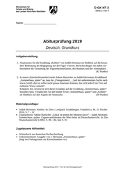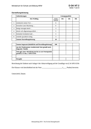 D GK NT 2 Ministerium für Schule und Bildung NRW Seite 7 von 8 Darstellungsleistung Anforderungen Lösungsqualität Der Prüfling maximal erreichbare Punktzahl 1 strukturiert seinen Text … 6 2 formuliert unter Beachtung … 6 3 belegt Aussagen durch … 3 4 drückt sich allgemeinsprachlich … 5 5 formuliert lexikalisch und … 5 6 schreibt sprachlich richtig. 3 Summe Darstellungsleistung 28 Summe insgesamt (inhaltliche und Darstellungsleistung) 100 EK ZK DK aus der Punktsumme resultierende Note gemäß nach- folgender Tabelle Note ggf. unter Absenkung um bis zu zwei Notenpunkte gemäß § 13 Abs. 2 APO-GOSt Paraphe Berechnung der Endnote nach Anlage 4 der Abiturverfügung auf der Grundlage von § 34 APO-GOSt Die Klausur wird abschließend mit der Note ________________________ (____ Punkte) bewertet. Unterschrift, Datum: Abiturprüfung 2019 – Nur für den Dienstgebrauch!