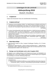 Ministerium für Schule und Bildung NRW D GK NT 3 Seite 2 von 9 2. Medien/Materialien • entfällt 5. Zugelassene Hilfsmittel • Wörterbuch zur deutschen Rechtschreibung • Unkommentierte Ausgabe von J. Hermann „Sommerhaus, später“ (liegt im Prüfungsraum zur Einsichtnahme vor) 6. Vorgaben für die Bewertung der Schülerleistungen Teilleistungen – Kriterien a) inhaltliche Leistung Teilaufgabe 1 Anforderungen Der Prüfling maximal erreichbare Punktzahl 1 verfasst eine aufgabenbezogene Einleitung unter Nennung von Autorin, Titel, Text- sorte, Erscheinungsdatum. 3 2 stellt den Inhalt der Erzählung kurz dar, etwa: • gemeinsames Arbeiten (Einlagern von Kohlen) einer Gruppe von Menschen in einem vormals landwirtschaftlich genutzten Gebäudekomplex, • eingeschobene Gedanken und Äußerungen über die Strenge des jetzigen und der kommenden Winter, • Erscheinen eines Jungen (Vincent), als Anlass für die in Rückblende erzählte Geschichte seiner Eltern, besonders seiner Mutter, • Tod der Mutter nach mehreren Schlaganfällen; nach Aussage des Erzählers infolge eines gebrochenen Herzens, • Leiden und Tod der Mutter verursacht durch gescheiterte Liebe. 5 3 erläutert die Gestaltung der Figurenkonstellation, etwa: • Gruppe um den Erzähler (wir) ohne Konturierung einzelner Figuren als Bewohner eines ländlichen Anwesens bei gemeinsamer Arbeit, • Aufgeschlossenheit der Gruppe gegenüber der besonderen Situation, • Begegnung mit der einzigen einen Namen tragenden und deutlich konturierten Figur Vincent (Vincent, wörtlich „der Sieger“), • außergewöhnliche Reife und Ernsthaftigkeit des Jungen, • Betonung der Individualität des vierjährigen Jungen durch genaue Beschreibung, Spiel mit Stereotypen, z. B. „er hatte keine Rotznase“; Hervorhebung der Beson- derheit, vor allem auch durch seine Bedeutung für die Gruppe, • Darstellung der Familiensituation Vincents: Trennung der Eltern, Krankheit und Tod der Mutter, • hierbei Fokussierung auf Mutter und deren Erkrankung und Tod. 8 Abiturprüfung 2019 – Nur für den Dienstgebrauch!