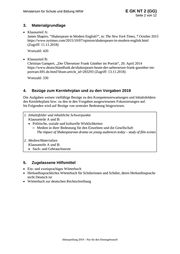 Ministerium für Schule und Bildung NRW E GK NT 2 (GG) Seite 2 von 12 3. Materialgrundlage • Klausurteil A: James Shapiro, “Shakespeare in Modern English?”, in: The New York Times, 7 October 2015 https://www.nytimes.com/2015/10/07/opinion/shakespeare-in-modern-english.html (Zugriff: 11.11.2018) Wortzahl: 420 • Klausurteil B: Christian Gampert, „Der Übersetzer Frank Günther im Porträt“, 20. April 2014 https://www.deutschlandfunk.de/shakespeare-heute-der-uebersetzer-frank-guenther-im- portraet.691.de.html?dram:article_id=283293 (Zugriff: 13.11.2018) Wortzahl: 330 4. Bezüge zum Kernlehrplan und zu den Vorgaben 2019 Die Aufgaben weisen vielfältige Bezüge zu den Kompetenzerwartungen und Inhaltsfeldern des Kernlehrplans bzw. zu den in den Vorgaben ausgewiesenen Fokussierungen auf. Im Folgenden wird auf Bezüge von zentraler Bedeutung hingewiesen. 1. Inhaltsfelder und inhaltliche Schwerpunkte Klausurteile A und B: • Politische, soziale und kulturelle Wirklichkeiten – Medien in ihrer Bedeutung für den Einzelnen und die Gesellschaft The impact of Shakespearean drama on young audiences today – study of film scenes 2. Medien/Materialien Klausurteile A und B: • Sach- und Gebrauchstexte 5. Zugelassene Hilfsmittel • Ein- und zweisprachiges Wörterbuch • Herkunftssprachliches Wörterbuch für Schülerinnen und Schüler, deren Herkunftssprache nicht Deutsch ist • Wörterbuch zur deutschen Rechtschreibung Abiturprüfung 2019 – Nur für den Dienstgebrauch!