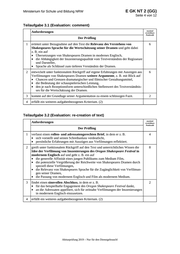 Ministerium für Schule und Bildung NRW E GK NT 2 (GG) Seite 4 von 12 Teilaufgabe 3.1 (Evaluation: comment) maximal erreichbare Punktzahl Anforderungen Der Prüfling 1 erörtert unter Bezugnahme auf den Text die Relevanz des Verstehens von Shakespeares Sprache für die Wertschätzung seiner Dramen und geht dabei z. B. ein auf • Übersetzungen von Shakespeares Dramen in modernes Englisch, • die Abhängigkeit der Inszenierungsqualität vom Textverständnis der Regisseure und Darsteller, • Sprache als Schlüssel zum tieferen Verständnis der Dramen. 6 2 entwickelt unter funktionalem Rückgriff auf eigene Erfahrungen mit Auszügen aus Verfilmungen von Shakespeares Dramen weitere Argumente, z. B. mit Blick auf • Chancen und Grenzen dramaturgischer und filmischer Gestaltungsmittel, • die Bedeutung der schauspielerischen Leistung, • den je nach Rezeptionsform unterschiedlichen Stellenwert des Textverständnis- ses für die Wertschätzung der Dramen. 6 3 kommt auf der Grundlage seiner Argumentation zu einem schlüssigen Fazit. 2 4 erfüllt ein weiteres aufgabenbezogenes Kriterium. (2) Teilaufgabe 3.2 (Evaluation: re-creation of text) maximal erreichbare Punktzahl Anforderungen Der Prüfling 1 verfasst einen rollen- und adressatengerechten Brief, in dem er z. B. • sich vorstellt und seinen Schreibanlass verdeutlicht, • persönliche Erfahrungen mit Auszügen aus Verfilmungen reflektiert. 4 2 greift unter funktionalem Rückgriff auf den Text und unterrichtliches Wissen die Idee der Verfilmung von Inszenierungen des Oregon Shakespeare Festival in modernem Englisch auf und geht z. B. ein auf • die generelle Affinität eines jungen Publikums zum Medium Film, • die potenzielle Vergrößerung der Reichweite von Shakespeares Dramen durch speziell diese Verfilmungen, • die Relevanz von Shakespeares Sprache für die Zugänglichkeit von Verfilmun- gen seiner Dramen, • die Passung von modernem Englisch und Film als modernem Medium. 8 3 findet einen sinnvollen Abschluss, in dem er z. B. • für das beispielhafte Engagement des Oregon Shakespeare Festival dankt, • an die Adressaten appelliert, sich für zeitnahe Verfilmungen der Inszenierungen in modernem Englisch einzusetzen. 2 4 erfüllt ein weiteres aufgabenbezogenes Kriterium. (2) Abiturprüfung 2019 – Nur für den Dienstgebrauch!
