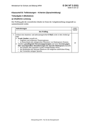 Ministerium für Schule und Bildung NRW E GK NT 2 (GG) Seite 5 von 12 b) Darstellungsleistung/sprachliche Leistung Das Referenzniveau des Gemeinsamen europäischen Referenzrahmens (GER) für die Darstellungsleistung/sprachliche Leistung ist im jeweiligen Lehrplan ausgewiesen. Kommunikative Textgestaltung Anforderungen Der Prüfling maximal erreichbare Punktzahl 1 richtet seinen Text konsequent und explizit im Sinne der Aufgabenstellung auf die Intention und den Adressaten aus. 6 2 beachtet die Textsortenmerkmale der jeweils geforderten Zieltextformate. 4 3 erstellt einen sachgerecht strukturierten Text. 4 4 gestaltet seinen Text hinreichend ausführlich, aber ohne unnötige Wiederholungen und Umständlichkeiten. 4 5 belegt seine Aussagen durch eine funktionale Verwendung von Verweisen und Zitaten. 3 Ausdrucksvermögen/Verfügbarkeit sprachlicher Mittel Anforderungen Der Prüfling maximal erreichbare Punktzahl 6 löst sich vom Wortlaut des Ausgangstextes und formuliert eigenständig. 4 7 verwendet funktional einen sachlich wie stilistisch angemessenen und differenzierten allgemeinen und thematischen Wortschatz. 6 8 verwendet funktional einen sachlich wie stilistisch angemessenen und differenzierten Funktions- und Interpretationswortschatz. 4 9 verwendet einen variablen und dem jeweiligen Zieltextformat angemessenen Satzbau. 7 Sprachrichtigkeit Anforderungen Der Prüfling maximal erreichbare Punktzahl beachtet die Normen der sprachlichen Korrektheit im Sinne einer gelingenden Kommunikation. 10 Wortschatz 9 11 Grammatik 8 12 Orthografie 4 Abiturprüfung 2019 – Nur für den Dienstgebrauch!