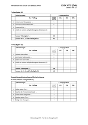 E GK NT 2 (GG) Ministerium für Schule und Bildung NRW Seite 9 von 12 Teilaufgabe 3.1 Anforderungen Lösungsqualität Der Prüfling maximal erreichbare Punktzahl 1 erörtert unter Bezugnahme … 6 2 entwickelt unter funktionalem … 6 3 kommt auf der … 2 4 erfüllt ein weiteres aufgabenbezogenes Kriterium: (2) …………………………………………………………….. …………………………………………………………….. Summe Teilaufgabe 3.1 14 Summe der 1., 2. und Teilaufgabe 3.1 42 EK ZK DK Teilaufgabe 3.2 Anforderungen Lösungsqualität Der Prüfling maximal erreichbare Punktzahl 1 verfasst einen rollen- … 4 2 greift unter funktionalem … 8 3 findet einen sinnvollen … 2 4 erfüllt ein weiteres aufgabenbezogenes Kriterium: (2) …………………………………………………………….. …………………………………………………………….. Summe Teilaufgabe 3.2 14 Summe der 1., 2. und Teilaufgabe 3.2 42 EK ZK DK Darstellungsleistung/sprachliche Leistung Kommunikative Textgestaltung Anforderungen Lösungsqualität Der Prüfling maximal erreichbare Punktzahl 1 richtet seinen Text … 6 2 beachtet die Textsortenmerkmale … 4 3 erstellt einen sachgerecht … 4 4 gestaltet seinen Text … 4 5 belegt seine Aussagen … 3 Abiturprüfung 2019 – Nur für den Dienstgebrauch! EK ZK DK