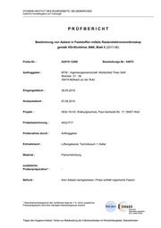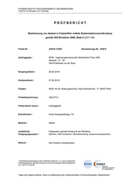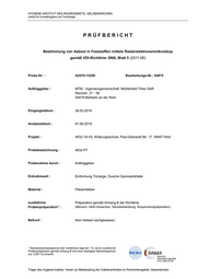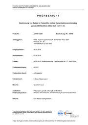 HYGIENE-INSTITUT DES RUHRGEBIETS, GELSENKIRCHEN Institut für Umwelthygiene und Toxikologie PRÜFBERICHT Bestimmung von Asbest in Feststoffen mittels Rasterelektronenmikroskop gemäß VDI-Richtlinie 3866, Blatt 5 (2017-06) Probe-Nr. : A2019-13260 Bearbeitungs-Nr.: 64975 Auftraggeber : MTM - Ingenieurgemeinschaft Mühlenfeld Thies GbR Reichstr. 37 - 39 45479 Mülheim an der Ruhr Eingangsdatum : 28.05.2019 Analysedatum : 07.06.2019 Projekt : 4632-19-V0, Walburgisschule, Paul-Gerhardt-Str. 17, 59457 Werl Probebezeichnung : 4632-P17 Probenahme durch : Auftraggeber Entnahmeort : Lüftungskanal, Technikraum 1, Keller Material : Flanschdichtung zusätzliche Probenpräparation* : - Befund : Kein Asbest nachgewiesen, Probe enthält organische Fasern. * Standardnachweisgrenze des Verfahrens liegt bei 1 %, durch zusätzliche Probenpräparation wird eine niedrigere Nachweisgrenze erreicht Träger des Hygiene-Instituts: Verein zur Bekämpfung der Volkskrankheiten im Ruhrkohlengebiet, Gelsenkirchen