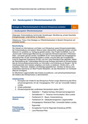 Integriertes Klimaschutzkonzept des Landkreises Germersheim Arbeitsschritte 1. Mögliche Kooperationen mit der EDG oder lokalen Akteuren analysieren und be- schließen 2. Weitere offene Fragen klären 3. Businessplan (final) 4. Entwurf des Gesellschaftsvertrags 5. Beschluss des Kreistages 6. Unterzeichnung des Gesellschaftsvertrages (notariell beurkundet) 7. Erste Projekte initiieren ▪ Stabstelle 1 Projekte Hochbau (Klimaschutzmanagement) ▪ Dezernat 3 - Bauen, Umwelt ▪ FB 31 Bauen, Kreisentwicklung Verantwortung / ▪ FB 34 Gebäudemanagement, Liegenschaften Akteure ▪ Ggf. Kooperationspartner wie EDG oder lokale Akteure wie Thüga Energie GmbH, der Pfalzwerke Gruppe oder der Stadt- werke Germersheim GmbH Finanzierungs- ▪ Eigenmittel und Fördermög- lichkeiten Zeitplanung und Bewertung Maßnahmenbeginn Laufzeit Fristigkeit 3. Quartal 2022 dauerhaft langfristig Umsetzungskosten THG-Einsparpotenzial Priorität Personalkosten 5 Tage / Monat Mittel; abhängig von den Umge- setzten Maßnahmen an der Ener- (grobe Annahme, da verschiedene gieversorgung der Liegenschaften Rahmenbedingungen noch nicht be- schlossen sind) 103