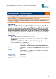 Integriertes Klimaschutzkonzept des Landkreises Germersheim Öffentlichkeitsinitiative „Partner im Klimaschutz“ Ö2 ➢ Handlungsfeld: Öffentlichkeitsarbeit Zielgruppe: Industrie, Gewerbe/Handel/Dienstleistungen & Handwerk Zielsetzung / Fokus: Eine Strategie zur Aktivierung der Unternehmen für den Klimaschutz soll erarbeitet werden. Beschreibung Im Rahmen der Öffentlichkeitsinitiative "Partner im Klimaschutz" soll eine Ansprache der Unternehmen im Landkreis während der Umsetzungsphase des integrierten Klimaschutz- konzepts durchgeführt werden. Es ist eine persönliche Ansprache durch die Wirtschafts- förderung des Landkreises mit Unterstützung eines einheitlichen Fragebogens vorgese- hen. Hauptbestandteil der Gespräche wird sein, wie der Klimaschutz in den Unternehmen bereits verankert ist und ob Interesse an einer Partnerschaft bzw. gemeinsamen Öffent- lichkeitsinitiative besteht. Arbeitsschritte 1. Partneroffensive mit Unternehmen konzeptionieren 2. Befragung der Unternehmen zum Klimaschutz durch die Wirtschaftsförderung 3. Auswertung 4. Identifizierung und Auswahl von Partner-Unternehmen je Zielgruppe 5. Öffentlichkeitsarbeit und Verstetigung ▪ Landrat, Kreisbeigeordnete ▪ Stabstelle 1 - Projekte-Hochbau (Klimaschutzmanagement) ▪ Stabstelle 4 - Wirtschaftsförderungsgesellschaft und Touris- Verantwortung / mus Akteure ▪ Zentralbereich 11 - Personal, Kommunikation, Büro Landrat ▪ Unternehmen im Landkreis Finanzierungs- ▪ Eigenmittel und Fördermög- ▪ Sponsoren lichkeiten 106