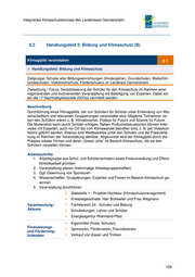 Integriertes Klimaschutzkonzept des Landkreises Germersheim 9.3 Handlungsfeld 3: Bildung und Klimaschutz (B) Klimagipfel veranstalten B1 ➢ Handlungsfeld: Bildung und Klimaschutz Zielgruppe: Schüler aller Bildungseinrichtungen (Kindergärten, Grundschulen, Weiterfüh- rendeschulen, Volkshochschule, Förderschulen) im Landkreis Germersheim Zielsetzung / Fokus: Sensibilisierung der Schüler für den Klimaschutz im Rahmen einer inspirierenden und motivierenden Veranstaltung mit Beteiligung von Experten. Dabei sol- len die 17 Nachhaltigkeitsziele (SDGs) vermittelt werden. Beschreibung Durchführung eines Klimagipfels, der von Schülern für Schüler unter Einbindung von Wis- senschaftlern und relevanten Gruppierungen veranstaltet wird. Mögliche Teilnehmer ne- ben den Schülern wären z. B. Klimaforscher, Fridays for Future und Scients for Future. Die Moderation kann durch Schüler erfolgen. Neben Podiumsdiskussionen können Inter- views mit Experten, auch vor Ort die vom Klimawandel betroffen sind, z. B. per Videokon- ferenz geführt werden. Ebenso sind Wettbewerbe unter den Schulen und die Preisverlei- hung im Rahmen der Veranstaltung denkbar. Abgerundet wird der Klimagipfel durch die Präsenz lokaler Firmen und deren „Green-Jobs“ im Bereich Klimaschutz, die sie den Schülern vorstellen können. Arbeitsschritte 1. Arbeitsgruppe aus Schul- und Schülervertretern sowie Kreisverwaltung und Öffent- lichkeitsarbeit gründen 2. Veranstaltung planen (mehrmalige Arbeitsgruppentreffen) 3. Ggf. Gewinnung von Sponsoren 4. Wissenschaftler, Gruppierungen, Experten und Firmen im Bereich Klimaschutz ge- winnen 5. Veranstaltung durchführen ▪ Stabstelle 1 - Projekte-Hochbau (Klimaschutzmanagement) ▪ Kreisbeigeordnete: Herr Buttweiler und Frau Wegmann Verantwortung / ▪ Fachbereich 24 - Schulen und Bildung Akteure ▪ Schulleitungen, Lehrer und Schüler ▪ Energieagentur Rheinland-Pfalz ▪ Eigenmittel (Kreis, Schulen) Finanzierungs- ▪ Sponsoren, Förderverein, Freundeskreis und Fördermög- lichkeiten ▪ Verkauf von Essen und Trinken 109