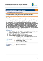 Integriertes Klimaschutzkonzept des Landkreises Germersheim Energie und Nachhaltigkeit im Unterricht platzieren B2 ➢ Handlungsfeld: Bildung und Klimaschutz Zielgruppe: Schüler von Schulen des Landkreises Germersheim (als Träger) Zielsetzung / Fokus: Sensibilisierung der Schüler für den Klimaschutz. Beschreibung LehrerInnen im Landkreis sollen motiviert werden das Thema Klimaschutz in den Unter- richt zu integrieren. Zum klassischen Unterricht in den Schulen können Praxisbeispiele in Form von Exkursionen zu Klimaschutzprojekten wie Erneuerbare-Energien-Anlagen oder zur nachhaltigen Mobilität initiiert werden. Die Kreisverwaltung (Klimaschutzmanagement und Fachbereich 24 - Schulen und Bildung) kann hierfür Materialen und Kooperations- partner (für Exkursionen) sammeln und bereitstellen. Die Nutzung des Klimaschutzportals (vgl. Maßnahme Ö1) für die Bekanntmachung möglicher Exkursionsziele ist denkbar. Ebenso kann ein Bereich in den Schulbibliotheken für den Klimaschutz eingerichtet wer- den. Eine Verbindliche Vorgabe durch die Aufsichts- und Dienstleistungsdirektion (ADD) das Thema Klimaschutz im Unterricht zu platzieren ist zu prüfen. Das Thema Klimaschutz kann fester Bestandteil zum Bildungsplan werden. Arbeitsschritte 1. Material Energie und Nachhaltigkeit für den Unterricht sammeln, (von LehrerInnen, Energieagentur RLP, Bundes- und Landesministerien) 2. Kooperationspartner (Exkursionsziele) suchen 3. Material und Exkursionsziele den Lehrern bereitstellen 4. Rückkopplung/Netzwerkbildung (fortlaufend) über Aktualisierungen ▪ Stabstelle 1 - Projekte-Hochbau (Klimaschutzmanagement) ▪ Fachbereich 24 - Schulen und Bildung Verantwortung / ▪ Aufsichts- und Dienstleistungsdirektion (ADD) Akteure ▪ Schulleitungen und Lehrer ▪ Energieagentur Rheinland-Pfalz Finanzierungs- ▪ Eigenmittel (Kreis, Schulen) und Fördermög- lichkeiten 111