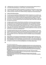225 2008 auch deshalb besser als andere Länder gestemmt, weil es einen im internationalen Vergleich der 226 OECD-Staaten hohen Industrialisierungsgrad hat. Der Beitrag der Industrie zur volkswirtschaftlichen Wert - 227 schopfung in Deutschland Jag 2017 bei 22,9%.6 228 Ein zentraler Standortfaktor fir die deutsche Industrie ist das Vorhandensein vollständiger industrieller 229 Wertschöpfungsketten. Das Fundament dieser Wertschöpfungsketten bilden die energieintensiven Indust- 230 rien, die die Grund- und Werkstoffe herstellen, auf denen die weiteren Fertigungsprozessè aufbauen. Sie 231 stehen in einem internationalen Wettbewerb und sind daher in besonderem Maße abhaпgig von einer 232 wettbewerbsfähigen, preisginstigen und sicheren Energieversorgung. 233 Entwicklung energieintensive Industrien 234 Trotz pòsitiver wirtschaftlicher Entwicklung muss festgehalten werden, dass Deutschland zumindest in den 235 energieintensiven Branchen vor besonderen Herausforderungen steht und teilweise von der Substanz lebt. 236 Hintergrund dieser Entwicklung ist, dass private Investitionen generell am Standort Deutschland nur zu - 237 rückhaltend getätigt werden.7 Exemplarisch dafürstehen die nominalen Nettoanlageinvestitionen der 238 energieintensiven Branchen —das sind die Bruttoanlageinvestitionen abziglich der Abschreibungen. Diese 239 sind im Schnitt der vergangenen Jahre (2000 bis 2014) deutlich negativ. Nur in den Jahren 2000 und 2008 240 hatten diese Branchen positive Nettoinvestitionen 8 241 Auch der Strukturwandel der energieintensiven Industriebranchen, die als Hersteller von Grundstoffen 242 vielfach Ausgangspunkt langer industrieller Wertschöpfungsketten sind, hat bereits begonnen. Einer schlei- 243 chenden De-Industrialisierung muss entgegengewirkt werden. Weitere Kostensteigerungen durch die Ab- 244 schaltung von Kohlekraftwerken drohen diesen Prozess zu beschleunigen. 245 Gerade aufgrund der engen Verknipfung mit der Grundstoffinddstrie drohen in den betroffenen Regionen 246 erhebliche negative Effekte durch Strukturbrache, wenn es nicht gelingt, die bestehenden Wertschöp- 247 fungsketten und Industrieverbunde zwischen Energie und Industrie zu erhalten. Wie oben aufgezeigt, ist 248 das reale Nettoanlagevermögen in alles energieintensiven Sektoren (Papier-, Chemie-, Baustoffindustrie, 249 Metallerzeugung) fast duгchgängigjedes Jahr gesunken. Die Gesamtindustrie verzeichnet hingegen ein 250 kleines Plus. Der Rockgang ist umso gravierender, da auch die aktivierten Ausgaben für Forschung und 251 Entwicklung der jeweiligen Branchen umfasst sind? 252 1 nnovationspotenziale 253 Der größte Anteil der Gesamtausgaben fir Forschung und Entwicklung wird in Deutschland durch die In- 254 dustrie bereitgestellt 10 Dadurch entwickelt sie innovative Technologien, effiziente Verfahren und markiert 255 die Basis von Wertschöpfungsketten. Sie trägt damit auch zur Lösung von Umweltproblemen und zum 256 nachhaltigen Umgang mit Ressourcen bei. Ihre gute Marktstellung und umfassende Kompetenz pradesti- 257 níerten deutsche Unternehmen als Entwickler, Anbieter und Leitanwender von neuen Technologien wie 258 der Sektorkopplung, der zirkulären Wirtschaft, nachhaltiger Mobilität, nachhaltiger, digitalisierter Wert- Vergleiche auch Bundesministerium fir Wirtschaft und Energie 2016: Unsere Industrie; Intelligent. Innovativ. Inter- national. Zahlen für 2017 aktualisiert. Fratzscher-Kommission 2015: Stärkung von Investitionen in Deutschland. 8 Statistisches Bundesamt 2017, Energieintensive Brànchen: Papier, Chemie, Glas/Keramik, sowie Metallerzeugung und -bearbeitung. 9 1W 2017: Energiepolitische Unsicherheit verzogert Investitionen in Deutschland. 1W policy 1° papér 13/2017. stifterverband 2016: Wissenschaftsstatistik des Stifterverbandes, Forschung und Entwicklung in der Wirtschaft. 9