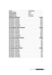 Name: xPC Shuttle 32-Bit / 64-Bit: 64-Bit Hardware-AES: nein Anzahl Kerne: DualCore Betriebsmodus: Powersave RAM-Geschwindigkeit in MB/s Blockgröße: 512 Byte 287,0 Blockgröße: 1024 Byte 412,0 Blockgröße: 2048 Byte 646,0 Blockgröße: 4096 Byte 792,0 Blockgröße: 8192 Byte 865,0 Blockgröße: 16384 Byte 814,0 Blockgröße: 32768 Byte 911,0 Device-Mapper-Geschwindigkeit in MB/s Blockgröße: 512 Byte 126,0 Blockgröße: 1024 Byte 136,0 Blockgröße: 2048 Byte 139,0 Blockgröße: 4096 Byte 354,0 Blockgröße: 8192 Byte 368,0 Blockgröße: 16384 Byte 387,0 Blockgröße: 32768 Byte 397,0 Linux-Crypto-Geschwindigkeit in MB/s Blockgröße: 512 Byte 27,0 Blockgröße: 1024 Byte 28,1 Blockgröße: 2048 Byte 29,0 Blockgröße: 4096 Byte 69,2 Blockgröße: 8192 Byte 68,8 Blockgröße: 16384 Byte 65,4 Blockgröße: 32768 Byte 70,2 TrueCrypt-Geschwindigkeit in MB/s Blockgröße: 512 Byte 23,4 Blockgröße: 1024 Byte 23,9 Blockgröße: 2048 Byte 23,6 Blockgröße: 4096 Byte 57,2 Blockgröße: 8192 Byte 57,3 Blockgröße: 16384 Byte 56,4 Blockgröße: 32768 Byte 56,9 Seite 82 von 107 | | 2010