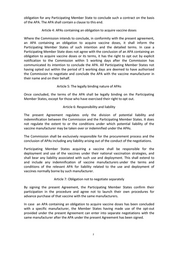 Ref.16.06.2020 Ares(2020)3114155 - 16/06/2020 Agreement Preamble Having regard to Article 4(5)(b) of Council regulation (EU) 2016/369 on the provision of 1 emergency support within the Union as amended by Council regulation (EU) 2020/521 of 14 April 2020 activating the emergency support under regulation (EU) 2016/369, and amending its provisions taking into account the COVID-19 outbreak (hereinafter “ESI” or “ESI regulation”); *** The European Commission (“the Commission”) and The following Member States: (XXX), hereinafter referred to as “the Participating Member States” Together referred to as “the Parties” Agree on the Following: Article 1: Objective and mandate of the Commission On the basis of the present agreement, the Commission is mandated to conclude, on behalf of the Participating Member States, Advance Purchase Agreements (“APA”) with vaccine manufacturers with the objective to procure vaccines for the purposes of combatting the COVID 19 pandemic at Union level. The Annex to this agreement sets out the negotiating directives for this purpose. Article 2: Acquisition of vaccine doses It is the Participating Member States, and not the Commission, that shall acquire vaccine doses from the manufacturers on the basis of the APAs unless otherwise agreed. All relevant vaccination policies shall therefore remain matters for the Participating Member States. Article 3: APAs containing a right to acquire vaccine doses Where the Commission concludes an APA in conformity with the present agreement that provides the right for the Participating Member States to acquire vaccine doses, the use of such a right shall take place by means of the conclusion of contracts between the Participating Member States and the vaccine manufacturers. There shall be no 1