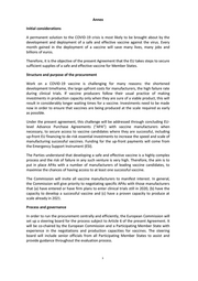 Annex Initial considerations A permanent solution to the COVID-19 crisis is most likely to be brought about by the development and deployment of a safe and effective vaccine against the virus. Every month gained in the deployment of a vaccine will save many lives, many jobs and billions of euros. Therefore, it is the objective of the present Agreement that the EU takes steps to secure sufficient supplies of a safe and effective vaccine for Member States. Structure and purpose of the procurement Work on a COVID-19 vaccine is challenging for many reasons: the shortened development timeframe, the large upfront costs for manufacturers, the high failure rate during clinical trials. If vaccine producers follow their usual practice of making investments in production capacity only when they are sure of a viable product, this will result in considerably longer waiting times for a vaccine. Investments need to be made now in order to ensure that vaccines are being produced at the scale required as early as possible. Under the present agreement, this challenge will be addressed through concluding EU- level Advance Purchase Agreements (“APA”) with vaccine manufacturers when necessary, to secure access to vaccine candidates where they are successful, including up-front EU financing to de-risk essential investments to increase the speed and scale of manufacturing successful vaccines. Funding for the up-front payments will come from the Emergency Support Instrument (ESI). The Parties understand that developing a safe and effective vaccine is a highly complex process and the risk of failure in any such venture is very high. Therefore, the aim is to put in place APAs with a number of manufacturers of leading vaccine candidates, to maximise the chances of having access to at least one successful vaccine. The Commission will invite all vaccine manufacturers to manifest interest. In general, the Commission will give priority to negotiating specific APAs with those manufacturers that (a) have entered or have firm plans to enter clinical trials still in 2020, (b) have the capacity to develop a successful vaccine and (c) have a proven capacity to produce at scale already in 2021. Process and governance In order to run the procurement centrally and efficiently, the European Commission will set up a steering board for the process subject to Article 6 of the present Agreement. It will be co-chaired by the European Commission and a Participating Member State with experience in the negotiations and production capacities for vaccines. The steering board will include senior officials from all Participating Member States to assist and provide guidance throughout the evaluation process. 3