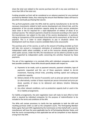 share the total cost related to the vaccine purchase but will in any case contribute no more than 50% of the total cost. Funding provided up front will be considered as an advance payment for any eventual purchase by Member States, thus reducing the amount that Member States will have to pay when eventually purchasing that vaccine. The up-front payments under the APAs shall be used by manufacturers to de-risk the necessary investments related to both vaccine development and clinical trials, and the preparation of the at-scale production capacity along the entire vaccine production value chain in the EU required for a rapid deployment of millions of doses of an eventual vaccine. The relevant payments should be structured according to the need of the manufacturer, but subject to the state of the vaccine development, in particular relying on transparency of the associated clinical data and its assessment, at the time of payment. This is in order to avoid obligations to pay in situations where the development work has shown a vaccine candidate likely to be unsuccessful. The purchase price of the vaccine, as well as the amount of funding provided up front will take into account a transparent estimation of production costs (supported by independent audits where available), as well as the resources already granted from other public sources. Under the APA, the manufacturer can be asked to provide ex post proof supported by independent audits concerning the activities financed by these payments. The aim of the negotiation is to conclude APAs with individual companies under the best possible conditions. These APAs should specify details with respect to: a) Payments to be made, such as payment amounts, payment schedules, type of payments requested and the use of those payments related to de-risk investment, financing clinical trials, providing working capital and scaling-up production capacity; b) Delivery details of the vaccine if successful, such as price per person immunised (or alternatively, number of doses required per person immunised and price per dose), quantity of doses to be delivered and delivery timeline following approval; and c) Any other relevant conditions, such as production capacity built or used in the EU or liability arrangements. For liability arrangements, the joint negotiation team will make its best effort to limit what is required by individual companies for the purpose of indemnification to be included in the terms and conditions of the APA. The APAs will contain provisions to clarify the law applicable to both the APA and resulting purchase orders as well as the competent courts. The Participating Member States agree that each APA negotiated by the Commission on their behalf with a vaccine manufacturer will have the same applicable law for all Participating Member States, and that the courts corresponding to that applicable law will be competent to hear disputes arising from that APA. 5