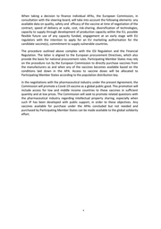 When taking a decision to finance individual APAs, the European Commission, in consultation with the steering board, will take into account the following elements: any available data on quality, safety and efficacy of the vaccine at time of negotiation of the contract, speed of delivery at scale, cost, risk-sharing, diversification of technologies, capacity to supply through development of production capacity within the EU, possible flexible future use of any capacity funded, engagement at an early stage with EU regulators with the intention to apply for an EU marketing authorisation for the candidate vaccine(s), commitment to supply vulnerable countries. The procedure outlined above complies with the ESI Regulation and the Financial Regulation. The latter is aligned to the European procurement Directives, which also provide the basis for national procurement rules. Participating Member States may rely on the procedure run by the European Commission to directly purchase vaccines from the manufacturers as and when any of the vaccines becomes available based on the conditions laid down in the APA. Access to vaccine doses will be allocated to Participating Member States according to the population distribution key. In the negotiations with the pharmaceutical industry under the present Agreement, the Commission will promote a Covid-19 vaccine as a global public good. This promotion will include access for low and middle income countries to these vaccines in sufficient quantity and at low prices. The Commission will seek to promote related questions with the pharmaceutical industry regarding intellectual property sharing, especially when such IP has been developed with public support, in order to these objectives. Any vaccines available for purchase under the APAs concluded but not needed and purchased by Participating Member States can be made available to the global solidarity effort. 6
