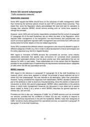 Article 3(3) second subparagraph “Traffic management measures” Stakeholder responses Some ISPs argued that NRAs should focus on the outcomes of traffic management, rather than monitoring the technical options chosen by each ISP to achieve these outcomes. They stated that, since the Regulation clearly acknowledges the need and right for operators to manage their networks, BEREC should remove wording such as “prima facie, appears to infringe this principle”. However, some CAPs and civil society respondents considered that the content of paragraph 57 (paragraph 54 of the draft Guidelines) did not reflect the letter of the Regulation, which requires traffic management to be transparent, non-discriminatory and proportionate, and would not ensure application-agnostic traffic management (see comments from CAPs and civil society below for further details on this and related arguments). Some ISPs considered that different network management rules should be allowed to apply to different categories of traffic (e.g. 5G) in order to allow development of future technologies and EU policy objectives (e.g. the EU’s Gigabit Society). With regard to innovative IoT/M2M services like connected car services, some industry stakeholders demanded that specific data connections for connected driver assistance systems and automated vehicles must be given priority over other applications that are not relevant for traffic or road safety. These stakeholders are of the opinion that the Regulation provides for two possible ways of implementing the requirements mentioned above: categories of traffic within the IAS and specialised services. BEREC response With regard to the reference in paragraph 57 (paragraph 54 of the draft Guidelines) to a measure “which, prima facie, appears to infringe” the principle of equal treatment set out in Article 3(3) first subparagraph, this was intended to be descriptive, rather than prescriptive. However, having considered the responses from stakeholders, BEREC decided to delete this part of the sentence in order to avoid any misunderstanding. Since this section is meant as an introduction to Article 3(3) second subparagraph, BEREC refers stakeholders to the sections below, in which traffic management measures are discussed in more detail and to section above related to Article 3 as a whole in which BEREC describes the general approach to Articles 3(2), 3(3) and 3(5). Providers are free to also use “categories of traffic” for IoT/M2M services such as connected car services, provided that the conditions of Article 3(3) are met, including to respond to objective technical requirements in line with the Guidelines. BEREC notes that “categories of traffic” should be clearly distinguished from specialised services, as explained in paragraph 75 (paragraph 72 of the draft Guidelines). 21