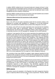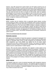 “Transparent, non-discriminatory and proportionate” Stakeholder responses Some of the CAP and civil society respondents agreed with the provisions relating to the safeguards for encrypted traffic (paragraph 60 / paragraph 57 of the draft Guidelines) and the clarification provided in the Guidelines on “reasonable traffic management”. However, some CAPs and civil society respondents considered that the content of paragraphs 58 and 60 (paragraphs 55 and 57 of the draft Guidelines) did not reflect the letter of the Regulation, which requires traffic management to be transparent, non-discriminatory and proportionate, and would not ensure application-agnostic traffic management (see comments from CAPs and civil society below for further details on this and related arguments). When considering whether a traffic management measure is proportionate in paragraph 61 (paragraph 58 of the draft Guidelines), some civil society respondents also urged BEREC and NRAs to take account of the risk of mis-classification of applications and that this risk will be higher according to the number of traffic classes applied by the ISP. They also argued that, when ISPs are able to use alternative types of traffic management, they should not favour a more intrusive type over a less intrusive type just because the less intrusive type is not “equally effective”. From the perspective of ISPs, they argued that the guidance in paragraph 60 (paragraph 57 of the draft Guidelines) not to treat encrypted traffic differently should be removed or amended since operators cannot recognise the exact type of content (voice, video, gaming), and therefore cannot manage it appropriately. Some ISPs also considered that the factors set out in paragraph 61 (paragraph 58 of the draft Guidelines) to take into account in determining whether a traffic management technique is proportionate were not based on the Regulation and were overly restrictive. They considered that applying overly restrictive criteria will prevent operators from developing new traffic management techniques that could be more effective and provide competitive differentiation. According to these views, the only condition that is required in the Regulation is that traffic management is reasonable and follows the transparency, non-discriminatory and proportionate requirements. They stated that paragraph 61 (paragraph 58 of the draft Guidelines) also implied that operators must provide ex ante justification for a traffic management measure (“evidence to show it will have that effect...”). Therefore, BEREC was advised to delete the third and fourth bullet points in paragraph 58. BEREC was also requested to provide a clear statement that the traffic management assessment/evaluation should be done ex post, rather than ex ante. BEREC response With regard to the treatment of encrypted traffic, BEREC considers that discrimination based on whether or not traffic is encrypted would not be consistent with the Regulation. In the first bullet point of paragraph 61 (paragraph 58 of the draft Guidelines) BEREC refers to the aim of “contributing to an efficient use of network resources and to optimisation of overall transmission quality”. In some of the subsequent bullet points, BEREC referred to “the aim”. Taking into account stakeholders’ responses, BEREC decided to change these references to from “the aim” to “this aim” to clarify that they refer back to the first bullet point. 22