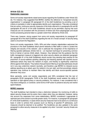 Article 3(3) (b) Stakeholder responses Some civil society respondents raised some issues regarding the Guidelines under Article 3(3) (b). For instance, they suggested that BEREC clarifies the reference to “recognised security organisations” in paragraph 85 (paragraph 81 of the draft Guidelines) by providing a set of criteria or examples in order to appropriately identify such organisations. They also considered that pro-active, continuous security measures of the kinds referred to in paragraphs 84 and 85 (paragraphs 80 and 81 of the draft Guidelines) should not be permitted, arguing that such measures are not consistent with the provisions of Article 3(3) third subparagraph and would involve processing personal data to a greater extent than allowed by Article 3(4). There was, however, strong support from some civil society respondents for paragraph 87 (paragraph 83 of the draft Guidelines) regarding the risk of a “broad concept” of security being used to circumvent the Regulation. Some civil society respondents, CAPs, ISPs and other industry stakeholders welcomed the provisions in the draft Guidelines which permit networks to filter traffic in order to “protect the integrity and security of the network”, and in particular the recognition of the importance of filtering spoofed addresses (Article 3(3) b) – an important technique for preventing common forms of denial of service (DoS) attack. However, they believed that the guidance that the traffic management measure is triggered only when security attacks are detected (paragraph 85 / paragraph 81 of the draft Guidelines) would counter long standing best practice for the prevention of source-address spoofing (detecting and blocking packets with spoofed source addresses before they leave the network of origin), and thereby to significantly undermine efforts against DoS attacks. They believe that permanent filtering of spoofed addresses should not in any way undermine network neutrality, and therefore urge BEREC to interpret source address spoofing as an attack upon the network in its own right, and that accordingly network operators may continue to maintain filters that identify and block source-spoofed packets whenever they occur. More generally, some civil society respondents and ISPs considered that the text of paragraphs 83-84 (paragraphs 79-80 of the draft Guidelines) would weaken the ability of operators to fight against piracy or security problems. For instance, it was considered that it may leave ambiguous, or constrain, some forms of ISP action to preserve security and restrict spam/malware. BEREC response The draft Guidelines had intended to draw a distinction between the monitoring of traffic to detect security threats and the action that is taken when they are detected. However, taking into account the responses from some stakeholders, BEREC considered it appropriate to rephrase part of this section to provide greater clarity. For instance, in paragraph 85 (paragraph 81 of the draft Guidelines), in cases where security measures have to be active on a continuous basis in order to achieve their purpose (such as filtering of spoofed IP addresses), such measures should be deemed to be justified. The Guidelines are also updated in the same paragraph to allow security measures to be applied only when “concrete” security threats are detected. 27