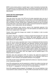 With regard to the requests to clarify how to identify “recognised security organisations”, this is a matter that will be determined at the national level. Article 3(3) (c) Stakeholder responses There was strong support from civil society respondents for the draft Guidelines’ approach to preventing impending network congestion and mitigating the effects of exceptional or temporary network congestion. Some civil society respondents and ISPs argued that, based on an interpretation of paragraph 92 (paragraph 88 of the draft Guidelines), NRAs will get involved in the decisions of ISPs on how to dimension their networks. They considered this would not be proportionate and would be potentially intrusive into ISPs’ operations and is not foreseen by the Regulation. It was also stated that congestion may arise regularly in an “appropriately” dimensioned network as a result of the actions of a minority of users (e.g. P2P filesharers), and should not always require investment. BEREC response Consistent with Article 3(3) (c) and Recital 15, in the case of ISPs using measures that go beyond what would be considered “reasonable traffic management measures”, NRAs would be empowered to assess whether such measures are recurrent or long-lasting, whether capacity expansion would be economically justified and whether equivalent categories of traffic are still treated equally, and this is reflected in the Guidelines. However, taking into account the responses from stakeholders, BEREC rephrased paragraph 93 (paragraph 89 of the draft Guidelines) in order to emphasise that this would be specifically part of an NRAs’ scrutiny of congestion management practices, rather than a general expectation for NRAs to assess the dimensioning of ISPs’ networks. Article 3(4) Stakeholder responses Some of the CAP and civil society respondents agreed with the provisions on the necessity and proportionality tests (paragraphs 94-97 / paragraphs 90-93 of the draft Guidelines). However, there were suggestions made among the CAP, other industry stakeholders and civil society respondents to include guidance and optional consultation with the European Data Protection Supervisor (EDPS) and Data Protection Authorities in the member states. It was noted that NRAs may not be empowered to enforce data protection legislation, so these bodies could be consulted by NRAs when they assess the privacy and data protection related impacts of traffic management. BEREC response BEREC modified paragraph 98 (paragraph 94 of the draft Guidelines) on “Compliance with Union law on data protection” to ensure that there is not an expectation for NRAs to assess an issue on which they are not empowered to intervene. The identification of appropriate competent authorities in each country will depend on national legislation. 28