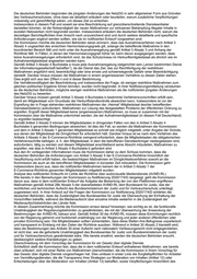 des Vertrags über die Arbeitsweise der Europäischen Union („AEUV“) gewährleistet werden soll. Diese Bestimmungen beruhen auf dem Grundsatz, dass Dienste der Informationsgesellschaft am Herkunftsort überwacht werden müssen und grundsätzlich dem Rechtssystem desjenigen Mitgliedstaates unterworfen werden, in dem der Anbieter niedergelassen ist (siehe Erwägungsgrund 22 der E-Commerce-Richtlinie). Dieser Grundsatz des Binnenmarkts ist auch als Herkunftslandprinzip oder Grundsatz der Herkunftslandkontrolle bekannt. Nach Artikel 3 Absatz 1 muss jeder Mitgliedstaat dafür Sorge tragen, dass die Dienste der Informationsgesellschaft, die von einem in seinem Hoheitsgebiet niedergelassenen Dienstleister erbracht werden, den in diesem Mitgliedstaat geltenden innerstaatlichen Vorschriften entsprechen, die in den koordinierten Bereich fallen. Artikel 3 Absatz 2 fügt hinzu, dass die Mitgliedstaaten den freien Verkehr von Diensten der Informationsgesellschaft aus einem anderen Mitgliedstaat nicht aus Gründen einschränken dürfen, die in den koordinierten Bereich fallen. Die deutschen Behörden werden daran erinnert, dass dieser Grundsatz durch das vorgeschlagene Gesetz über digitale Dienste nicht abgeändert wird, und dass alle nationalen Rechtsvorschriften, die vor oder nach der Annahme des Gesetzes über digitale Dienste erlassen wurden, mit dem Unionsrecht, einschließlich des in der Richtlinie über den elektronischen Geschäftsverkehr festgelegten Herkunftslandprinzips, in Einklang stehen müssen. Die in dem notifizierten Entwurf dargelegten Änderungen des NetzDG fallen in die koordinierten Bereiche der E-Commerce-Richtlinie, wie sie in deren Artikel 2 Buchstabe h definiert sind, da sie die zusätzlichen Verpflichtungen der Anbieter von sozialen Netzwerken in Bezug auf mutmaßlich illegale Inhalte, die von Dritten bereitgestellt werden, betreffen. Die Verpflichtungen im Rahmen des notifizierten Entwurfs werden von keinem der im Anhang der E-Commerce-Richtlinie aufgeführten Bereiche abgedeckt, die gemäß deren Artikel 3 Absatz 3 vom Geltungsbereich des Herkunftslandprinzips ausgenommen sind. Was den materiellen Anwendungsbereich betrifft, so fallen die vom notifizierten Entwurf erfassten Dienste (z. B. soziale Netzwerke; Video-Sharing-Plattformen) in den Anwendungsbereich der E-Commerce-Richtlinie. Hinsichtlich des territorialen Geltungsbereichs, so gelten, wie die deutschen Behörden in ihrer Antwort auf das Ersuchen der Kommissionsdienststellen um ergänzende Informationen bestätigt haben, die beabsichtigten Änderungen des NetzDG für dieselben Anbieter sozialer Netzwerke wie der aktuelle Text des NetzDG. Folglich würden die neuen Verpflichtungen nach dem notifizierten Entwurf für jeden Anbieter von sozialen Netzwerken mit mindestens zwei Millionen registrierten Nutzern in Deutschland gelten, unabhängig vom Ort der Niederlassung des Anbieters. In Bezug auf die Unterkategorie der Dienste der Informationsgesellschaft, die Videoplattformen darstellen würden, bestätigen die deutschen Behörden jedoch, dass jene mit weniger als zwei Millionen registrierten Nutzern in Deutschland den Verpflichtungen nur unterliegen, wenn sie ihren Sitz in Deutschland haben. Darüber hinaus geht die Kommission auf der Grundlage der von den deutschen Behörden in den verschiedenen Mitteilungen zum NetzDG übermittelten Informationen davon aus, dass der notifizierte Vorschriftenentwurf nach seiner Annahme nur für Video-Sharing-Plattformen mit mehr als zwei Millionen Nutzern in Deutschland gelten würde, und zwar auf der Grundlage des im Telemediengesetz vorgesehenen Ausnahmeverfahrens (welches das Ausnahmeverfahren nach Artikel 3 Absatz 4 der E-Commerce-Richtlinie umsetzt). Die Kommissiongeht weiter davon aus, dass die Anwendung des notifizierten Vorschriftenentwurfs im individuellen Anwendungsfall, unter den in Artikel 3 Absatz 4 der E-Commerce-Richtlinie festgelegten verfahrensrechtlichen Bedingungen für die Erbringung von Video-Sharing-Diensten in Deutschland unterliegen würde. Dabei erkennen die deutschen Behörden die Notwendigkeit an, den in der E-Commerce-Richtlinie verankerten Grundsatz des „Ursprungslandes“ in Bezug auf Video-Sharing-Plattformen zu beachten. In der Praxis bedeutet dies, dass Anbieter von sozialen Netzwerkdiensten, die nicht als Video-Sharing-Plattformen fungieren und in anderen Mitgliedstaaten als Deutschland niedergelassen sind, ebenfalls von den neuen Bestimmungen des notifizierten Entwurfs erfasst werden, soweit sie den Schwellenwert registrierter Nutzer erfüllen. Vor diesem Hintergrund ist die Kommission der Auffassung, dass die im notifizierten Entwurf enthaltenen Maßnahmen eine Einschränkung des freien Dienstleistungsverkehrs der Informationsgesellschaft aus anderen Mitgliedstaaten als Deutschland nach Artikel 3 Absatz 2 der E-Commerce-Richtlinie zur Folge haben könnten. Wie bereits im Rahmen der Notifizierung 2020/174/D übermittelten Bemerkungen dargelegt vertritt die Kommission die Auffassung, dass folgende Anforderungen als Beschränkungen des freien Verkehrs von Diensten der Informationsgesellschaft im Binnenmarkt angesehen werden könnten: • Anpassung der Ausgestaltung des Berichtsmechanismus bei der Erbringung von Dienstleistungen für Nutzer in Deutschland an die neuen Anforderungen des notifizierten Entwurfs sowie dessen Funktionsweise. Dies dürfte zu einer zusätzlichen Belastung der sozialen Netzwerke führen, die bereits verpflichtet sind, die Inhalte für bis zu 10 Wochen zu speichern und neue Informationsströme einzurichten, wenn ihre Dienste von Nutzern in Deutschland in Anspruch genommen werden. • Anpassung der Berichts- und Transparenzsysteme sozialer Netzwerke in Bezug auf ihre Dienste in Deutschland an die zusätzlichen detaillierten und spezifischen Anforderungen des notifizierten Entwurfs. Wie im NetzDG vorgesehen, sind solche Berichte in deutscher Sprache an die zuständige deutsche Behörde zu richten. • Grenzüberschreitend t