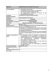 Modul 09/9 Wahlpflichtmodul: Die polizeiliche Vernehmung Lehrveranstaltungen - Kernaspekte in Vernehmungen - Die Zeugenvernehmung von Kindern und Jugendlichen - Besonderheiten der Beschuldigtenvernehmung - Die zeugenschaftliche Vernehmung vor Gericht und die Dokumentation der Vernehmung Lehrgebiete Kriminalistik, Psychologie, Rechtswissenschaften (beteiligte Fachgebiete) Studiengang Polizeivollzugsdient / Police Service Studienlage 6. Semester Voraussetzungen Teilnahme an den vorausgegangenen Modulen Leistungspunkte und Aufteilung 5 LP und 200 LZE LZE (45 Min) (96 LZE Kontaktstudium / 104 LZE Selbststudium) Prüfung Mündlich: 15 Min. Kompetenzrelevanz / Die Vernehmungstätigkeit hat sowohl für die zukünftigen Polizeibeamten Bedeutung für den Studiengang im Wach- und Wechseldienst als auch in der Kriminalpolizei eine hohe Bedeutung. Hiervon hängt zu einem großen Teil der Erfolg der polizeilichen Ermittlungstätigkeit und damit letztlich die erfolgreiche Strafverfolgung ab. Das Wahlpflichtmodul soll den Studierenden eine weitere Möglichkeit der eigenen Kompetenzsteigerung auf dem Gebiet der Vernehmung bieten. Lernziele und Lerninhalte des - Die Studierenden vertiefen ihr Verständnis zur Bedeutung der Moduls Vernehmungslehre für das Strafverfahren. Sie verbessern ihre Vernehmungskompetenz und ihre Fähigkeit, eine Beschuldigten- und Zeugenvernehmung eigenständig vorzubereiten, durchzuführen und zu dokumentieren. - Die Studierenden vertiefen ihr Wissen auf dem Gebiet der Vernehmungs- und Aussagepsychologie. - Die Studierenden kennen die Anforderungen an polizeiliche Aussagen vor Gericht. Art der Lehrveranstaltung Lehrgespräch, Übung fachpraktischer Anteil der LV 90 (LZE) rechtswissenschaftlicher Anteil 48 der LV (LZE) 46