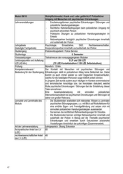 Modul 09/10 Wahlpflichtmodul: Krank und / oder gefährlich? Polizeilicher Umgang mit Menschen mit psychischen Erkrankungen Lehrveranstaltungen - Erscheinungsformen psychischer Erkrankungen / Störungen und polizeiliche Handlungsstrategien - Rechtliche Rahmenbedingungen beim polizeilichen Umgang mit psychisch erkrankten Person - Praktische Übungen zu polizeilichen Handlungsstrategien im Einsatz - Netzwerkpartner bezüglich psychischer Erkrankungen innerhalb und außerhalb der Polizei Lehrgebiete Psychologie, Einsatzlehre, SKE, Rechtswissenschaften, (beteiligte Fachgebiete) Kooperationspartner innerhalb und außerhalb der Polizei Studiengang Polizeivollzugsdient / Police Service Studienlage 6. Semester Voraussetzungen Teilnahme an den vorausgegangenen Modulen Leistungspunkte und Aufteilung 5 LP und 200 LZE LZE (45 Min) (72 LZE Kontaktstudium / 128 LZE Selbststudium) Prüfung Mündlich: 15 Min. Kompetenzrelevanz / Der Kontakt mit Menschen mit psychischen Störungen und Bedeutung für den Studiengang Erkrankungen stellt im polizeilichen Alltag keine Seltenheit dar. Dabei kommt es auch immer wieder zu sehr tragischen Einsatzverläufen, welche für die beteiligten Personen sogar tödlich enden können. In jüngerer Zeit wurde zudem auch häufiger im Kontext extremistischer und terroristischer Anschläge bzw. bei Amoktaten diskutiert, welche Rolle psychische Erkrankungen / Störungen bei der Entstehung dieser Taten einnehmen. Eine Auseinandersetzung mit sinnvollen polizeilichen Interventionsansätzen bei psychischen Erkrankungen und Störungen ist daher von großer Relevanz. Lernziele und Lerninhalte des - Die Studierenden erarbeiten sich relevantes Wissen zu zentralen Moduls psychischen Störungsgruppen, u.a. mit Blick auf Risikofaktoren für eine erhöhte Eigen- und Fremdgefährdung und setzen sich mit sinnvollen polizeilichen Handlungsstrategien auseinander. - Sie kennen die rechtlichen Rahmenbedingungen für Einsätze. - Die Studierenden kennen wichtige Netzwerkpartner innerhalb und außerhalb der Polizei in Bezug auf die Thematik psychischer Erkrankungen und erwerben durch Exkursionen praxisnahe Vorstellungen hinsichtlich der zukünftigen Zusammenarbeit. Art der Lehrveranstaltung Lehrgespräch, Übung, Exkursion fachpraktischer Anteil der LV 80 (LZE) rechtswissenschaftlicher Anteil 48 der LV (LZE) 47