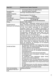 Modul 09/13 Wahlpflichtmodul: Digitale Polizeiarbeit - Kriminologische Relevanz des digitalen Raumes Modulteilbereiche - Bereiche der Digitalen Polizeiarbeit Lehrgebiete Kriminologie, Rechtswissenschaften, Einsatzlehre (beteiligte Fachgebiete) Studiengang Polizeivollzugsdienst / Police Service Studienlage 6. Semester Voraussetzungen Teilnahme an den vorausgegangenen Modulen Leistungspunkte und Aufteilung 5 LP und 200 LZE LZE (45 Min) (70 LZE Kontaktstudium/130 LZE Selbststudium) Prüfung Mündlich: 15 Min. je Student Der digitale Raum – insbesondere verkörpert durch die Sozialen Kompetenzrelevanz/ Medien – entwickelt sich immer stärker zu einem öffentlichen Raum der Bedeutung für den Studiengang Interaktion und Kommunikation aller Altersstufen. Diese Entwicklung hat auch immer größere Auswirkungen auf die Polizeiarbeit, exemplarisch genannt seien die polizeiliche Kommunikation im Rahmen von Krisensituationen, der Umgang mit digitalen Straftaten die aus dem Miteinander entstehen oder Fragen der digitalen Kriminalprävention. Gleichzeitig stellen Soziale Medien auch eine reichhaltige Quelle für Informationen über neue kriminologische Phänomene sowie auch über Tatverdächtige dar. Die Studierenden sollen in die Lage versetzt werden, den digitalen Raum als einen polizeilichen Einsatzraum zu erkennen, entsprechende polizeiliche Methoden anzuwenden und die Relevanz der Polizei in diesem Raum zu reflektieren. Sie sollen sich sicher in diesem bewegen können. Hierfür müssen die Studierenden Erkenntnisse aus dem Bereich des Strafrechtes, der Kriminologie und der Einsatzlehre kombinieren und sicher anwenden. - Die Studierenden haben sich mit dem digitalen Raum als einen Lernziele des Moduls öffentlichen Raum, dem Mediennutzungsverhalten und der Rolle der Polizei reflektierend auseinandergesetzt. - Die Studierenden sind in der Lage über Soziale Medien fachlich zu kommunizieren und kennen Vor- und Nachteile unterschiedlicher Kommunikationsformen. - Die Studierenden kennen aktuell relevante Soziale Medien. - Die Studierenden kennen kriminologische Grundlagen bezogen auf den digitalen Raum. - Die Studierenden kennen Möglichkeiten digitaler Kriminal- prävention sowie Ermittlungsmöglichkeiten. - Die Studierenden kennen und können gesellschaftliche Debatten insbesondere zum Spannungsverhältnis zwischen Überwachung und Sicherheit im digitalen Raum in einen entsprechenden Kontext einordnen. - Die Studierenden kennen die rechtlich relevanten Grundlagen für die digitale Polizeiarbeit und relevante Phänomene entsprechend juristisch einordnen und kriminologisch herleiten. Art der Lehrveranstaltung Vorlesung und Seminare fachpraktischer Anteil der LV 50 (LZE) 50