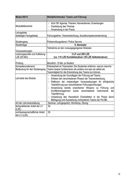 Modul 09/15 Wahlpflichtmodul: Teams und Führung - Kick Off: Agenda, Themen, Kennenlernen, Erwartungen Modulteilbereiche - Erarbeitung des Themas - Anwendung in der Praxis Lehrgebiete (beteiligte Fachgebiete) Führungslehre, Teamentwicklung, Sozialkompetenzentwicklung Studiengang Polizeivollzugsdienst / Police Service Studienlage 6. Semester Teilnahme an den vorausgegangenen Modulen Voraussetzungen Leistungspunkte und Aufteilung 5 LP und 200 LZE LZE (45 Min) (ca. 115 LZE Kontaktstudium / 85 LZE Selbststudium) Prüfung Mündlich: 15 Min. je Student Kompetenzrelevanz/ Polizeiarbeit ist Teamarbeit. Die Studenten erfahren, warum manche Bedeutung für den Studiengang Teams besser funktionieren als andere und was sie selbst als Teammitglied für die Entwicklung des Teams tun können. - Anwendung der Grundlagen der Führung auf Teams Lernziele des Moduls - Erleben der verschiedenen Phasen der Teamentwicklung - Reflexion der notwendigen Voraussetzungen für erfolgreiche Teamführung aus verschiedenen Führungsrichtungen - Anwendung bereits erworbenen Wissens zu Führung und Konfliktmanagement sowie verschiedener Instrumente der Teamführung. - Umsetzung des theoretisch Erarbeiteten in die Praxis durch Befragung und Auswertung vorhandener Teams der Pol BB. Art der Lehrveranstaltung Seminar, Lehrgespräch, Workshop, Übung fachpraktischer Anteil der LV 50 (LZE) rechtswissenschaftlicher Anteil 50 der LV (LZE) 52