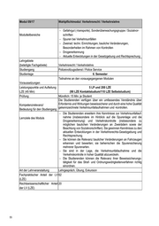 Modul 09/17 Wahlpflichtmodul: Verkehrsrecht / Verkehrslehre - Gefahrgut (-transporte), Sonderüberwachungsgruppe / Sozialvor- Modulteilbereiche schriften - Spuren bei Verkehrsunfällen - Zweirad: techn. Einrichtungen, bauliche Veränderungen, Besonderheiten im Rahmen von Kontrollen - Drogenerkennung - Aktuelle Entwicklungen in der Gesetzgebung und Rechtsprechung Lehrgebiete (beteiligte Fachgebiete) Verkehrsrecht / Verkehrslehre Studiengang Polizeivollzugsdienst / Police Service Studienlage 6. Semester Teilnahme an den vorausgegangenen Modulen Voraussetzungen Leistungspunkte und Aufteilung 5 LP und 200 LZE LZE (45 Min) (90 LZE Kontaktstudium/110 LZE Selbststudium) Prüfung Mündlich: 15 Min. je Student Die Studierenden verfügen über ein umfassendes Verständnis über Kompetenzrelevanz/ Erfordernis und Wirkungen beweissicherer und durch eine hohe Qualität gekennzeichnete Verkehrsunfallaufnahmen und -kontrollen. Bedeutung für den Studiengang - Die Studierenden erweitern ihre Kenntnisse zur Verkehrsunfallauf- Lernziele des Moduls nahme (insbesondere im Hinblick auf die Spurenlage und die Drogenerkennung) und Verkehrskontrolle (insbesondere zu möglichen baulichen Veränderungen an Zweirädern sowie der Beachtung von Sozialvorschriften). Sie gewinnen Kenntnisse zu den aktuellen Entwicklungen in der Verkehrsrechts-Gesetzgebung und Rechtsprechung. - Sie können die Relevanz baulicher Veränderungen an Fahrzeugen erkennen und bewerten; sie beherrschen die Spurensicherung mehrerer Spurenarten. - Sie sind in der Lage, die Verkehrsunfallaufnahme und die Verkehrskontrolle in hoher Qualität abzuwickeln. - Die Studierenden können die Relevanz ihrer Beweissicherungs- tätigkeit für das Straf- und Ordnungswidrigkeitenverfahren richtig einordnen. Art der Lehrveranstaltung Lehrgespräch, Übung, Exkursion Fachpraktischer Anteil der LV 62 (LZE) Rechtswissenschaftlicher Anteil 20 der LV (LZE) 55