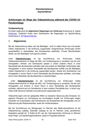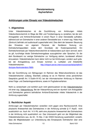 Dienstanweisung Asylverfahren Anhörungen im Wege der Videoanhörung während der COVID-19- Pandemielage Vorbemerkung Es finden ergänzend die allgemeinen Regelungen zur Anhörung Anwendung (s. Kapitel Anhörung). Zusätzlich finden beim Dolmetschen die Regelungen zur Sprachmittlung Anwendung (s. DA Sprachmittlung). 1. Allgemeines Bei der Videoanhörung halten sich die Beteiligten nicht im selben Raum auf und werden mittels Videotechnik in die Anhörung zugeschaltet. Entsprechende Anhörungen dürfen ausschließlich in Dienststellen des Bundesamtes stattfinden. Private Räumlichkeiten dürfen von den Beteiligten nicht genutzt werden. Unter Videoanhörungen ist die Durchführung von Anhörungen mittels Videokonferenztechnik im Wege der Bild- und Tonübertragung zu verstehen, bei der sich Antragsteller, Anhörer und Dolmetscher jeweils in einem anderen Raum in einer Dienststelle des Bundesamtes aufhalten oder sich jeweils ein Beteiligter (Entscheider oder Antragsteller) in einer anderen Dienststelle des Bundesamtes aufhält und die Beteiligten mittels Videotechnik in die Anhörung zugeschaltet werden. Soweit sich Dolmetscher und Antragsteller in einem Raum in einer Dienststelle des Bundesamtes aufhalten, sind diese durch einen Mitarbeiter des Bundesamtes zu beaufsichtigen. Unter Videodolmetschen ist die Durchführung von Anhörungen mittels Videokonferenztechnik im Wege der Bild- und Tonübertragung zu verstehen, bei der sich Antragsteller und Anhörer in einem Raum in einer Dienststelle des Bundesamtes aufhalten, während sich ein Dolmetscher in einer anderen Dienststelle bzw. in einem sog. Video-HUB (Zentrum) befindet und audiovisuell zugeschaltet wird. Videoanhörungen sind ein geeignetes Mittel zur besseren Steuerung des Einsatzes von eigenem Personal zur Vermeidung von kurzfristigem Ausfall von Anhörungen wegen Krankheit von Entscheidern oder Dolmetschern bei Anwesenheit der Antragsteller und zur Reduzierung des Reiseaufwandes, sowie der Verfahrensdauer. Bei der Durchführung von Befragungen im Rahmen des Widerrufsverfahrens ist die Videoanhörung zulässig. Ebenfalls zulässig ist sie im Rahmen eines persönlichen Gesprächs gemäß Art. 5 Dublin-III-VO, bei der informatorischen Anhörung im Rahmen eines Folge- und Zweitantragsverfahrens, sowie im Flughafenverfahren. Video-Anhörung währ. COVID 19 1/6 Stand 10/21