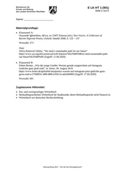 E LK HT 1 (W1) Seite 2 von 6 Name: _______________________ Materialgrundlage: • Klausurteil A: Osayande Igbinedion, Africa, in: GMT Emezue (ed.), New Voices. A Collection of Recent Nigerian Poetry, Oxford: Handel 2008, S. 135 – 137 Wortzahl: 273 Zitat: Africa Renewal Online, “We need a sustainable path for our future” https://www.un.org/africarenewal/web-features/%E2%80%98we-need-sustainable-path- our-future%E2%80%99 (Zugriff: 11.06.2020) • Klausurteil B: Eileen Breuer, „Wie der junge Goethe: Warum gerade ausgerechnet auf Instagram Gedichte ganz groß sind“, in: bento, 30. August 2019 https://www.bento.de/gefuehle/instapoetry-warum-auf-instagram-jetzt-gedichte-ganz- gross-sind-a-570d093c-4f8f-48f6-b356-5ccab2d44969 (Zugriff: 27.04.2020) Wortzahl: 601 Zugelassene Hilfsmittel: • Ein- und zweisprachiges Wörterbuch • Herkunftssprachliches Wörterbuch für Studierende, deren Herkunftssprache nicht Deutsch ist • Wörterbuch zur deutschen Rechtschreibung Abiturprüfung 2021 – Nur für den Dienstgebrauch!